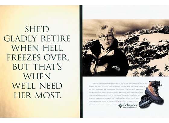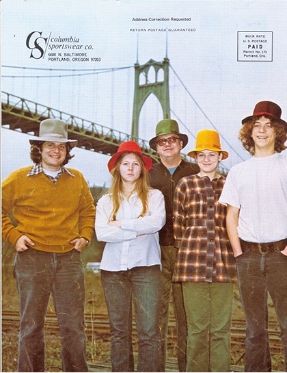 コロンビアのルーツは帽子問屋だったという事実を物語る名品が、このクラッシャーハットだ。ウール100%の生地で形作られたハットは、ツバが広く日差しを効果的に防げたうえ、リボンがあしらわれるなどファッション性も高く、男女を問わず多くの人々に愛用された。ヒットした理由は他にもある。柔らかいウール素材を使っているため、丸めてコンパクトに持ち運ぶことができる点、またウールならではの高い保温性があり、濡れても冷たくならない点などもアウトドアユースで重宝された所以だ。また、下の写真のように豊富なカラーバリエーションが用意されており、洋服とのコーディネートを楽しむこともできた。