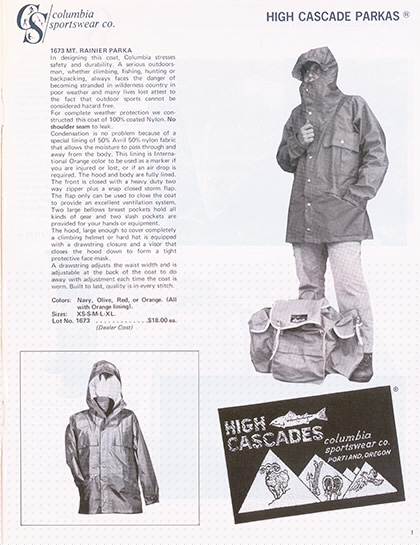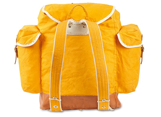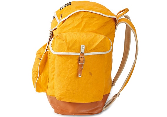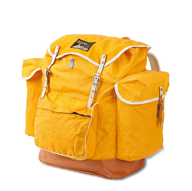 70年代、「ハイカスケード」と名付けられた新しいラインがコロンビアから登場した。パシフィックノースウエストを走るカスケード山脈にちなんで名付けられたこのラインは、バックパックを中心とした本格派のアウトドアギアを取り揃えていた。下のバックパックもそのひとつ。耐久性と軽量性に優れたナイロン製ボディ、頑丈なレザーを用いたボトムなど、現代まで続くバックパックの原型がすでに形作られていることがわかる。メイン収納はマチ幅が広く大容量。さらに、両サイドと中央にも収納スペースを備えるなど十分な機能性を有している。鮮やかなイエローは、おそらくアウトドアでの視認性を高めるためのものだろう。