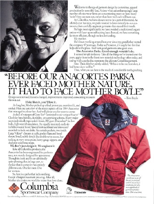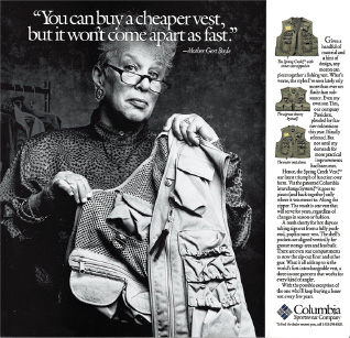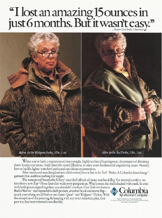 コロンビアの創始者である父、ポール・ラムフロムが逝去した後、社長を継いだ夫のニールにも先立たれ、多額の借金を背負うという厳しい状況のなか、ガート・ボイルが選んだのは、会社を再建するという道だった。普通の主婦であった彼女だが、強い決意のもとに経営努力を重ね、ついにはコロンビアをアメリカ最大級のアウトドアメーカーに押し上げる。「何か壁にぶつかったり、苦境に立たされたときこそ、人間はいろいろなことをより早く、より深く学べると思うんです。私の場合がまさにそうでした。そうした苦境のなかでビジネスに関することを身に付け、実践してきたのです」と、かつてガートは語っているが、ものづくりにおいて彼女自身が人並み外れたアイデアウーマンであったことも、サクセスストーリーを語るうえで欠かせない事実であろう。コロンビアを象徴するアイテムであるフィッシングベストは、まさにその最たるものといえる。