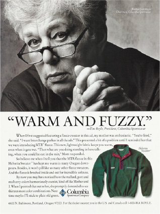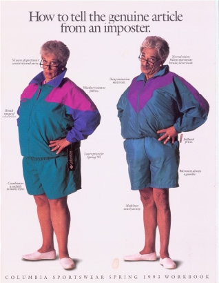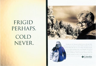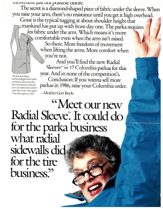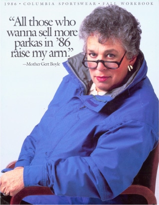 大きな実績を積み重ねてきたガート・ボイル。 2019年95歳で逝去するまで、コロンビアの会長として、ほぼ毎日のように本社に出勤していた。当時、その理由を彼女にたずねると、「むしろ、50年も皆勤しているのに、それをストップさせる理由ってあるかしら?もちろん、家にとどまって古くからの友人とゆっくり過ごす手段もあるわ。でも、誰がそれをやりたいと思う!?」と。しかし、誰よりもコロンビアを愛しているがゆえ、ということは語らずとも明らかだろう。その想いの強さは、ガート自らが広告をはじめ、コロンビアの様々なグラフィックに登場していたことからも読み取れる。これは、自身が生み出したプロダクトの品質に対して絶対的な自信を持っているからこそできたこと。自らが広告に登場することについて、彼女はこう語っていた。「モデルなんて食事みたいなものです。おいしいものはすぐに思い出せなくても、まずいものは確実に思い出すでしょう(笑)」