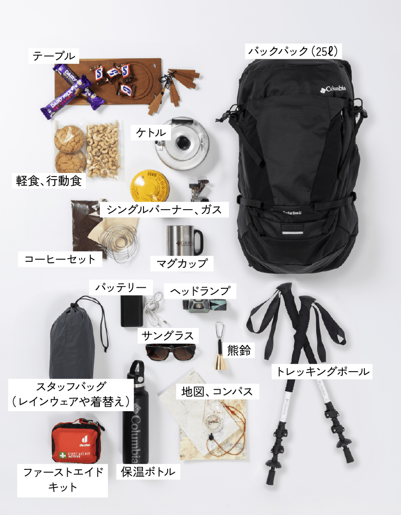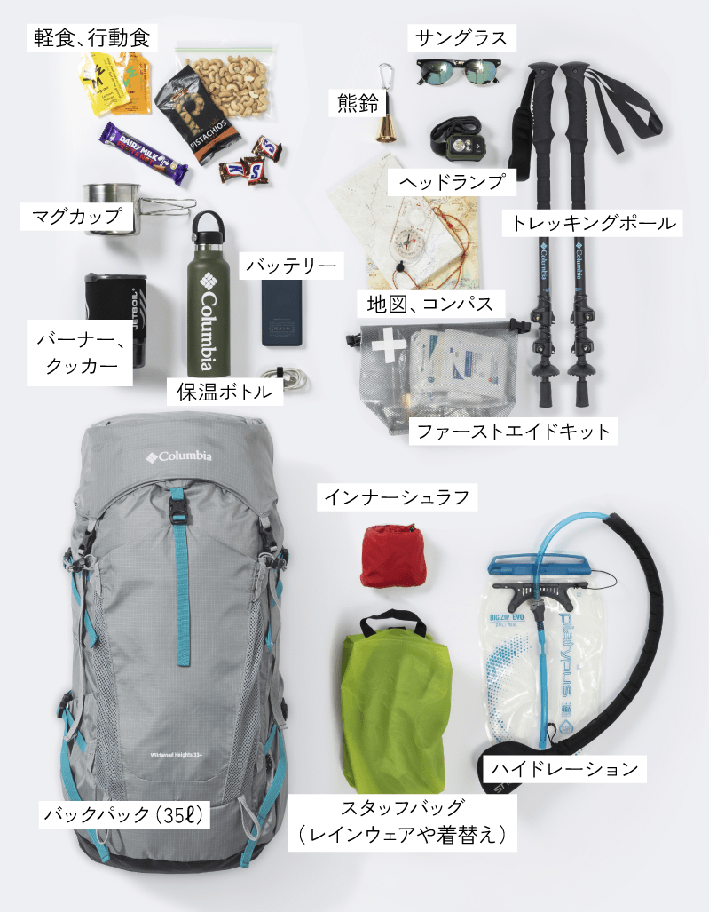 ただし日帰りだからといって装備は怠らずに。デイハイクといえど、行動食や水分、ファーストエイドキット、レインウェアは欠かさずに携行したい。