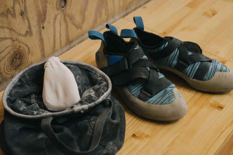 ▲(写真左)チョークバッグとチョーク、(写真右)シューズ
