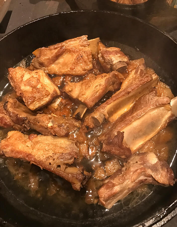 スペアリブやスネ肉、軟骨、鶏肉であれば手羽先や手羽元など、なんでも良い。硬いお肉や骨付きのお肉と調味料と水を入れて、蓋をして天板にのせ、丸一日火にかけておく。この写真の例では、豚のスペアリブに塩胡椒、醤油、砂糖、みりん、酒と、ごくシンプルな味付け。