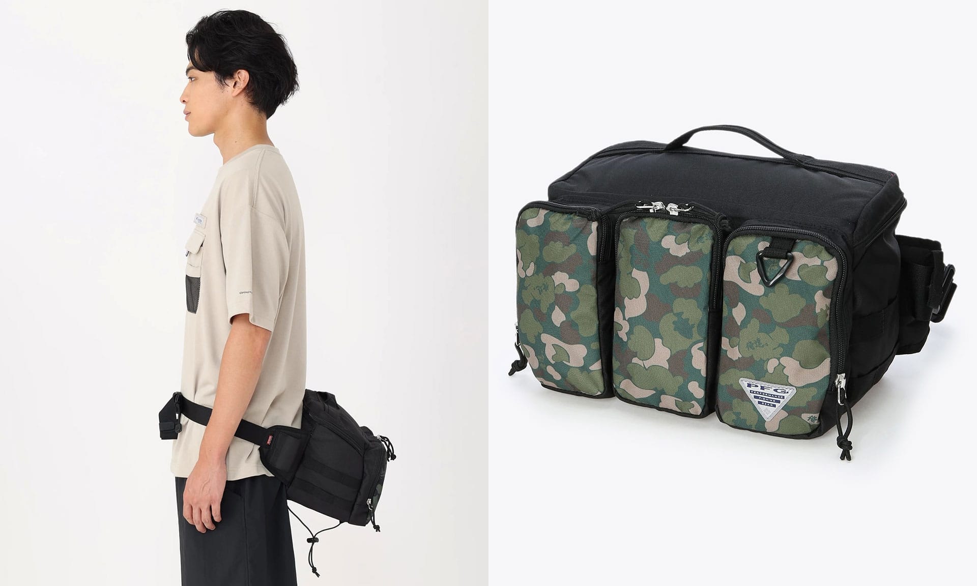 PFGアスリート&プロアングラーの秦拓馬氏&伊藤巧氏とコラボレーションしたヒップバッグは、釣り好きの人に刺さるギミックが満載です。小分け収納に便利なポケット類やプライヤーホルダー、底部のバンジーコートなど、プロのこだわりが随所に。それぞれが考案したカモ柄のコラボカラーも要チェック!