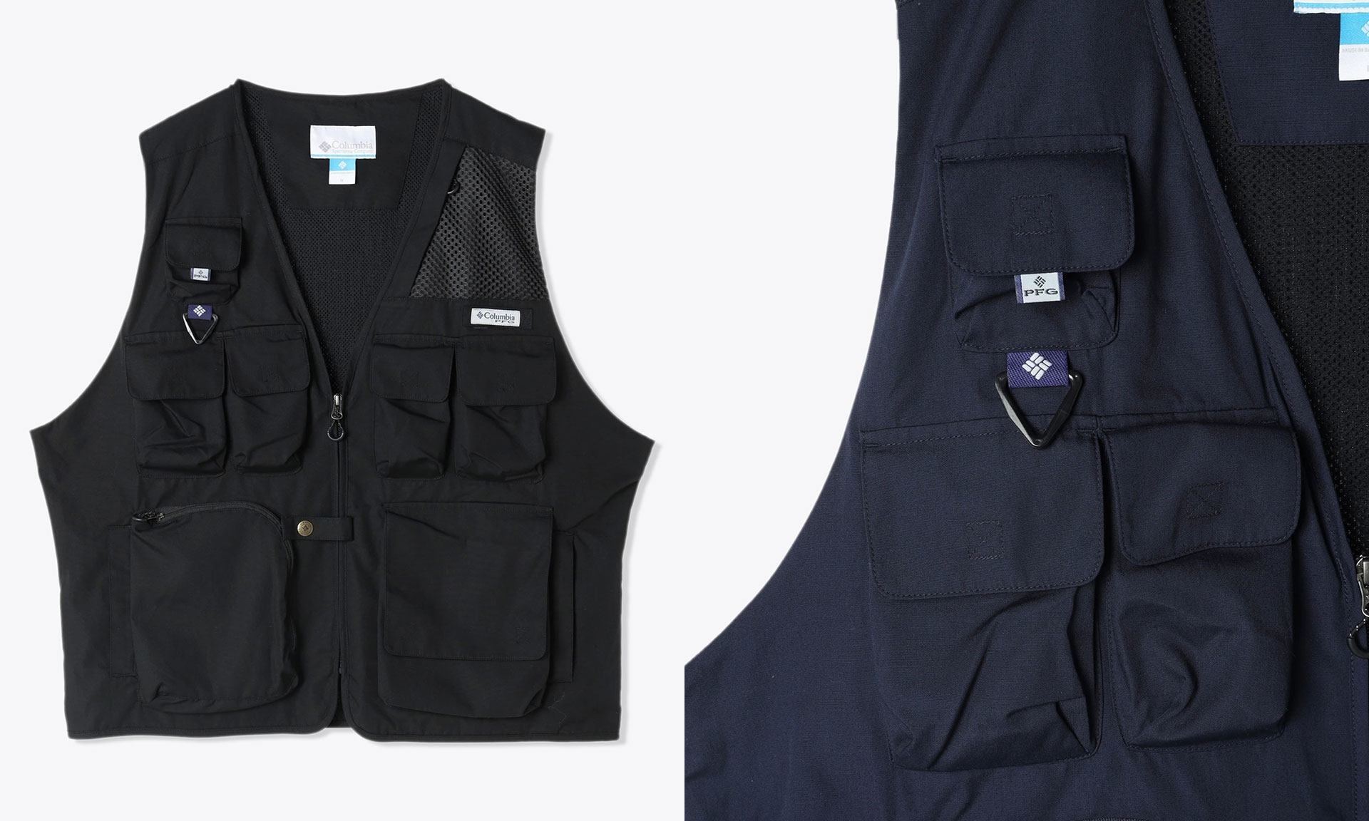 PFGを象徴するアイテムと言えばベスト! ということで、ヴィンテージフィッシングベストをベースに、シルエットとディテールをアップデートした新作コラボアイテムをご紹介。最大の特徴は、バッグが不要なほど充実した各種ポケット。こちらも撥水機能のオムニシールドを搭載しているので、小雨の際も安心です。