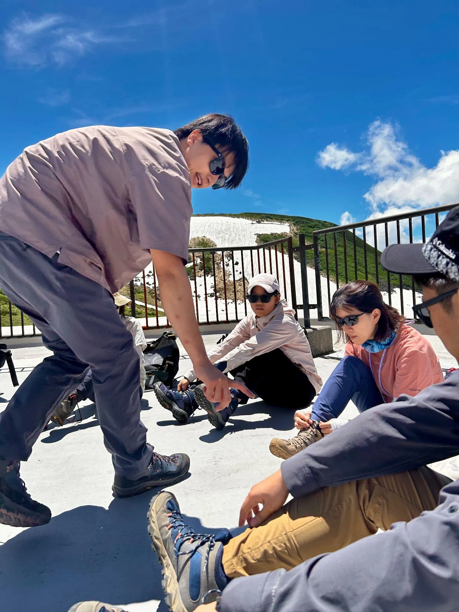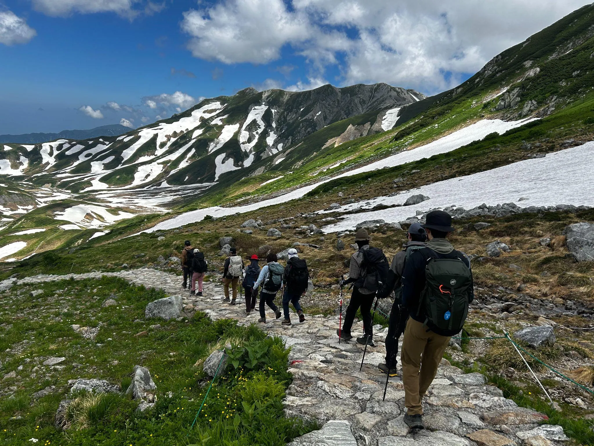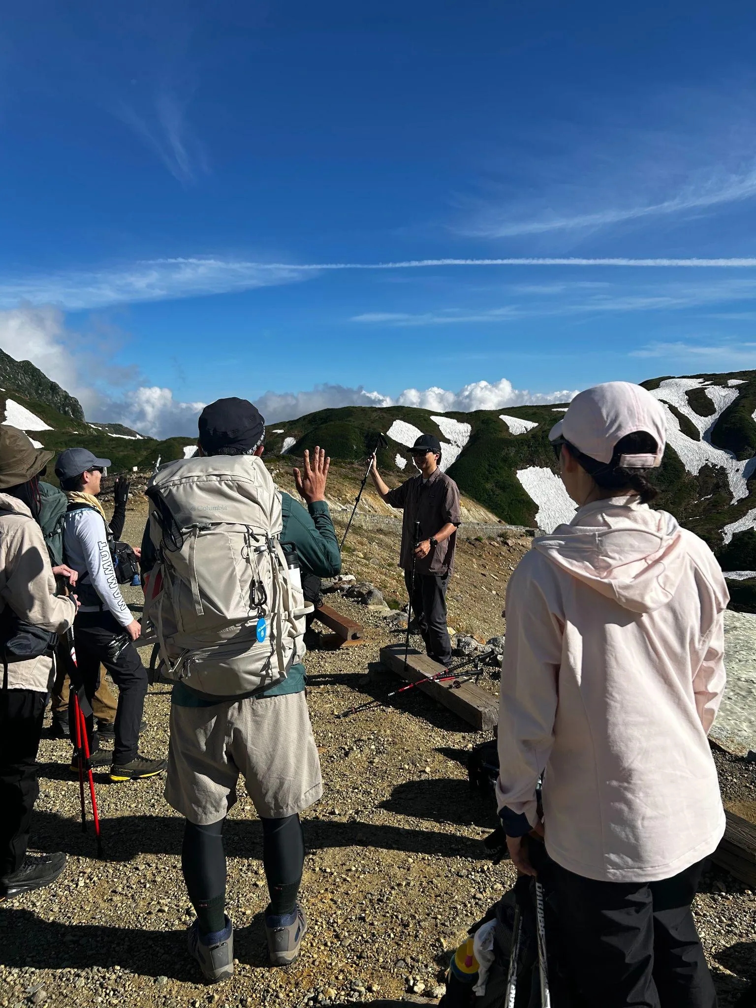 初日は室堂に集合し、自己紹介の後さっそく靴紐の結び方やザックの背負い方のレクチャーを受けました。参加者同士でも確認し合い、準備を整えたらいざ出発です。