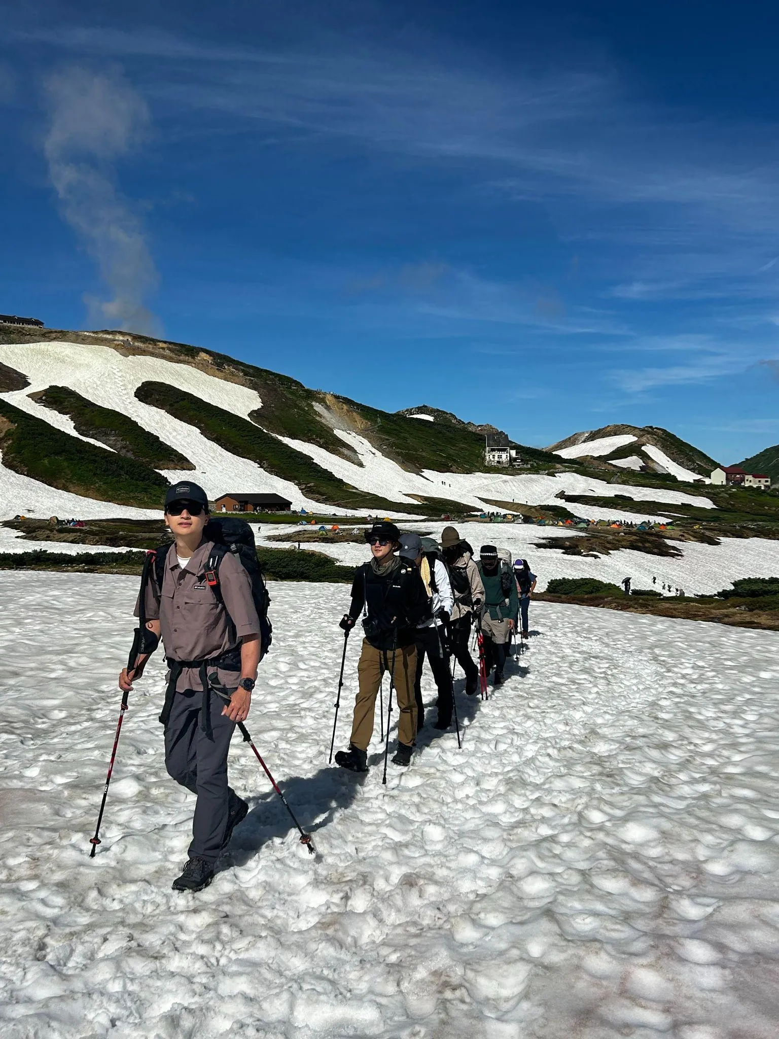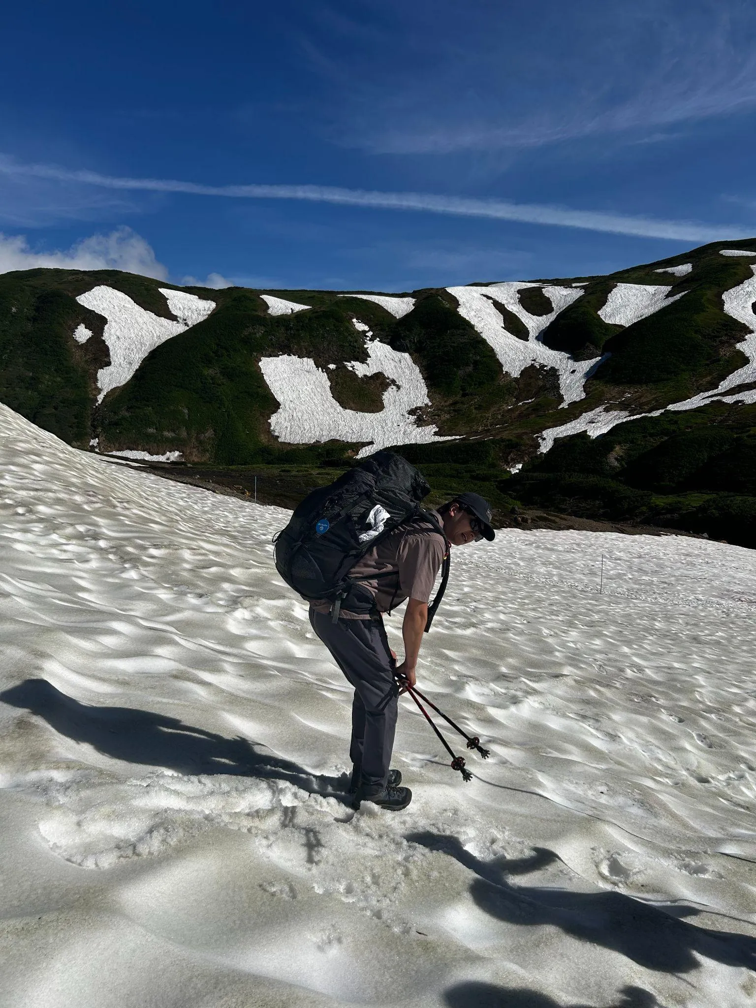 雪渓ポイントが出てきたので、雪上の歩き方のレクチャーを受けます。滑りそうで恐々足を踏み出すと足裏の角度でむしろ滑りやすくなる、と聞くと参加者はへっぴり腰にならないようにポールを使いながらゆっくり歩き進めていきました。