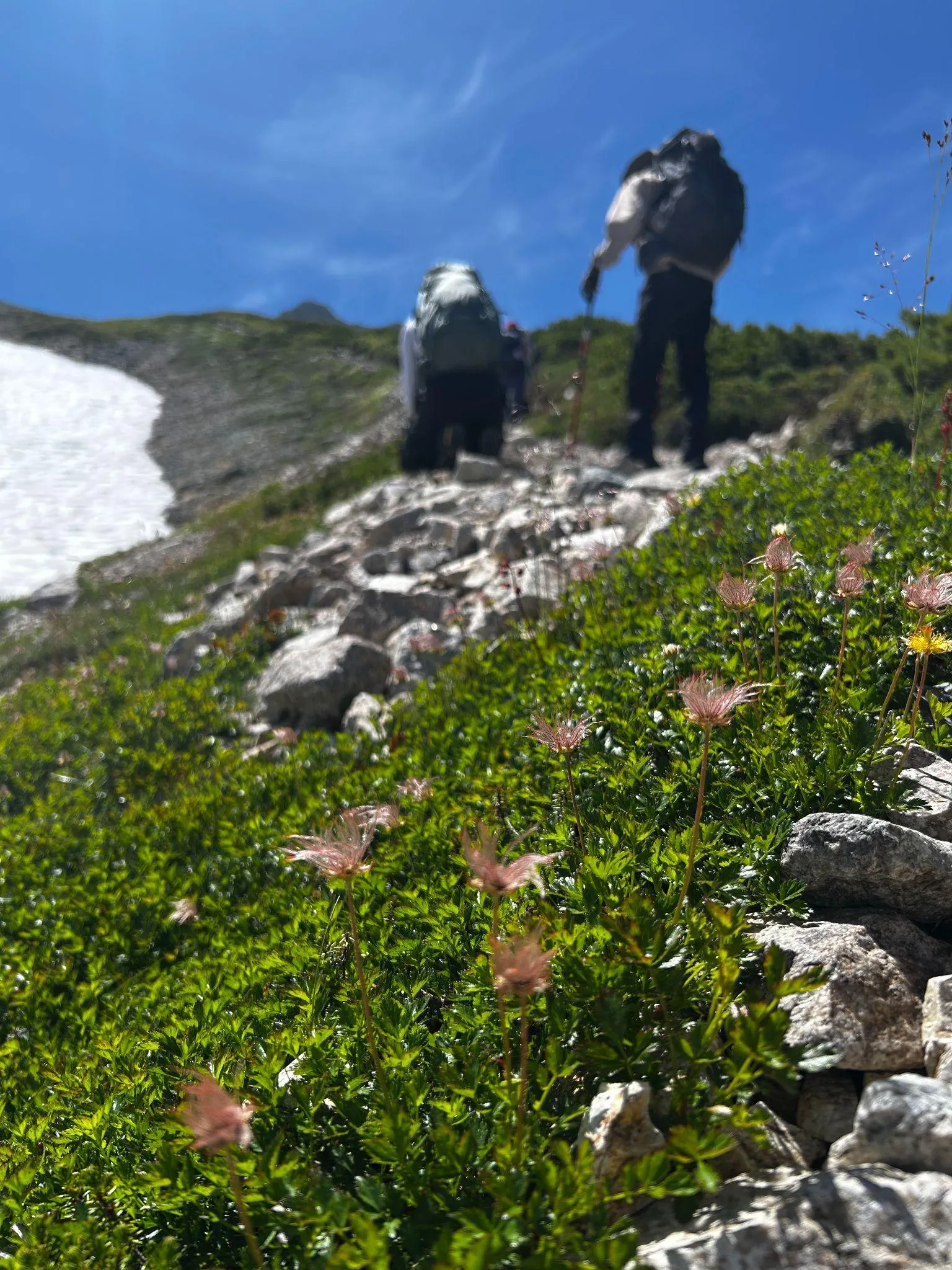 雪渓を抜け登山道を歩いていくと、あたり一面に高山植物のイワカガミやチングルマが。白やピンクの花が緑の草に映えると、写真撮影に勤しみます。