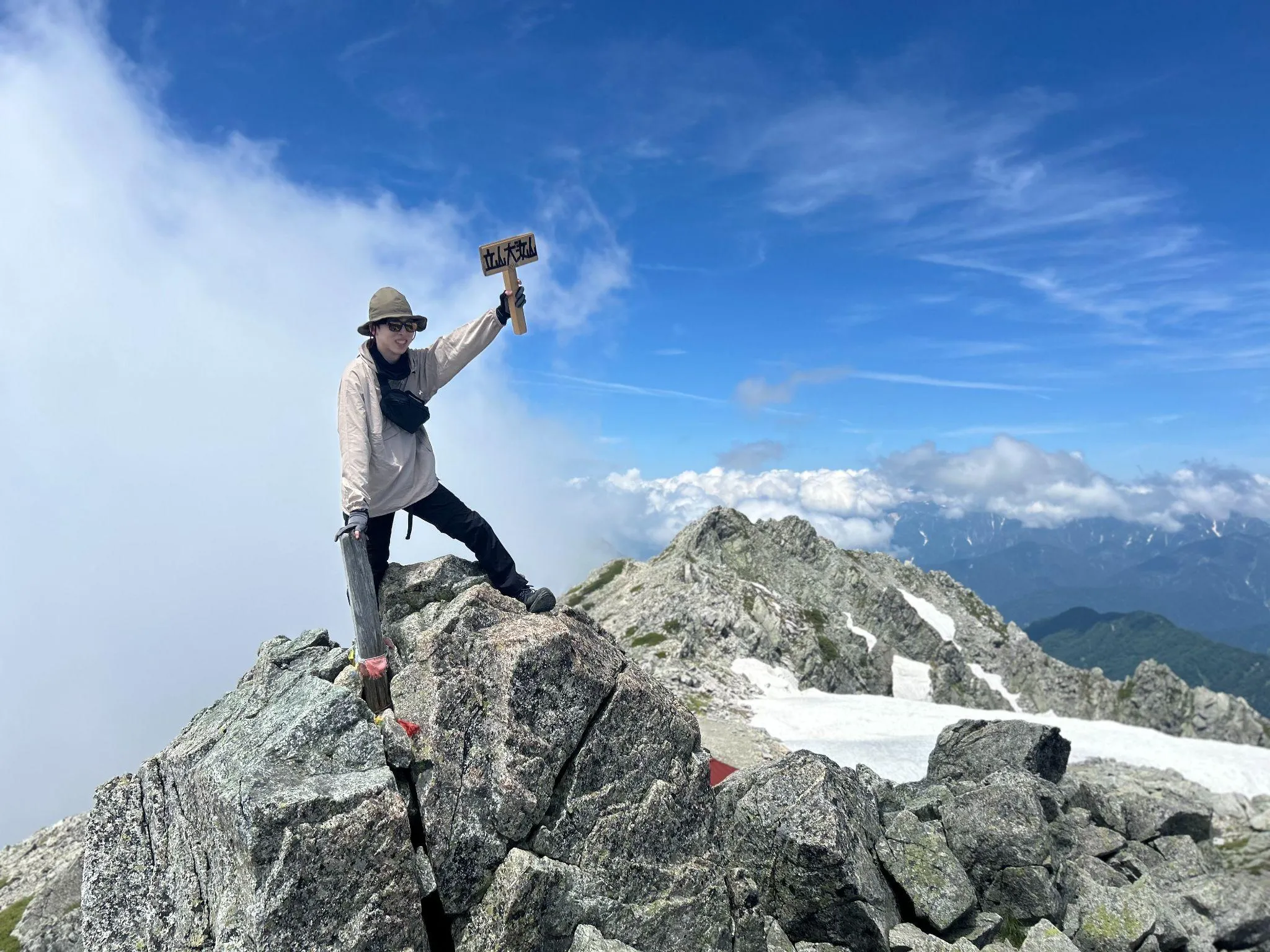 そしていよいよ立山三山のひとつ、富士ノ折立です。頂上直下は岩場になっているため大きなザックは置いて、山頂を目指します。岩をしっかり掴み滑落に気をつけながら全員で登頂しました。