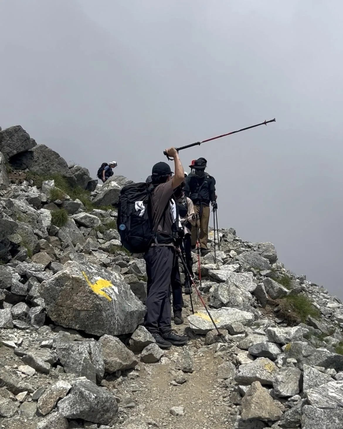 山頂から少し下ると雲が上がってきました。下山時にはトレッキングポールの握り方を変えることで、狭く小石の多い道も安全に下山することができると学びました。
