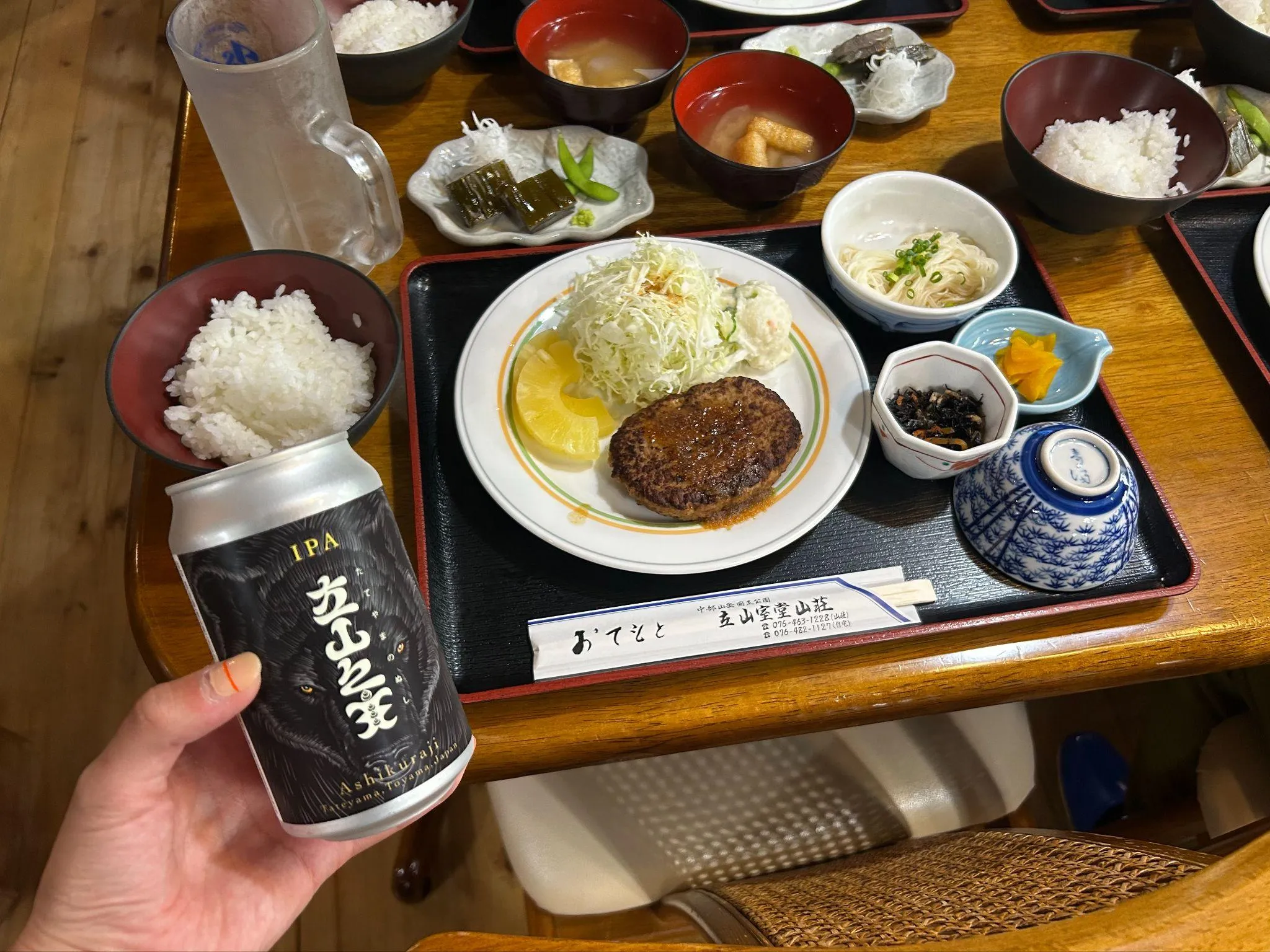 今回の山行の楽しみのひとつに、雷鳥荘の温泉がありました。宿には温泉が湧いており、雄大な山々を眺めながら湯に浸かるひとときは登山の疲れを癒してくれます。温泉でリラックスしたあとは、夕食の時間です。