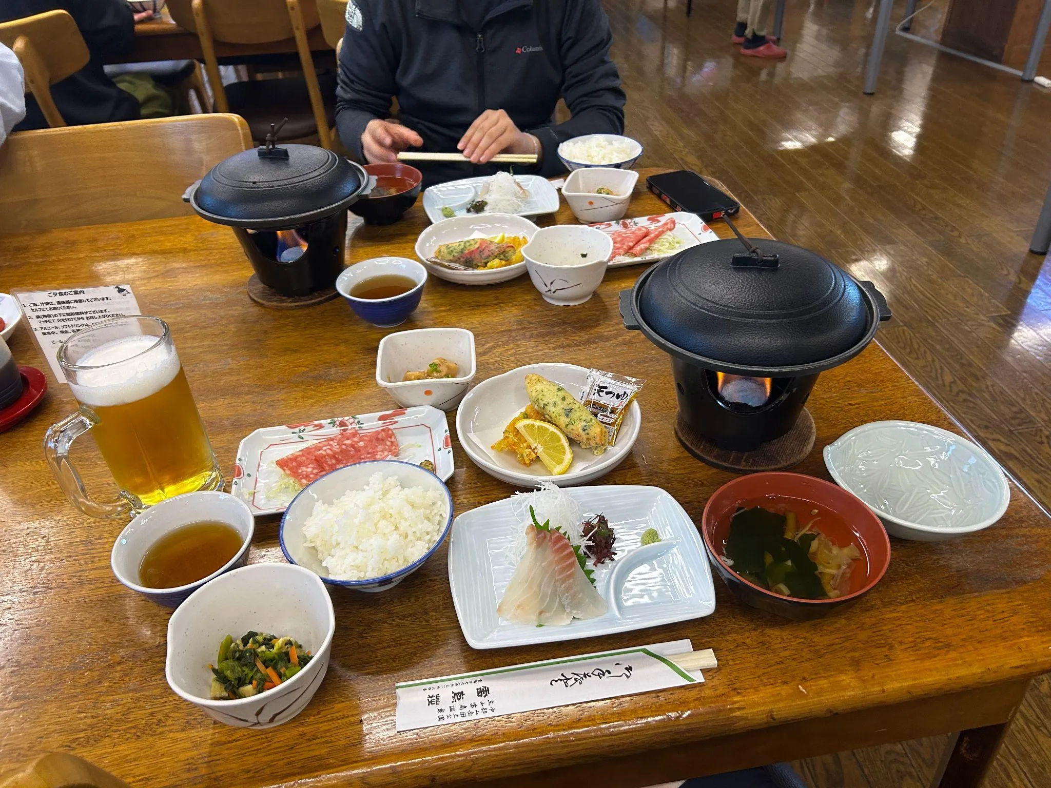 お刺身や天ぷら、陶板焼きと山にいるとは思えない豪華な料理に舌鼓を打ちます。