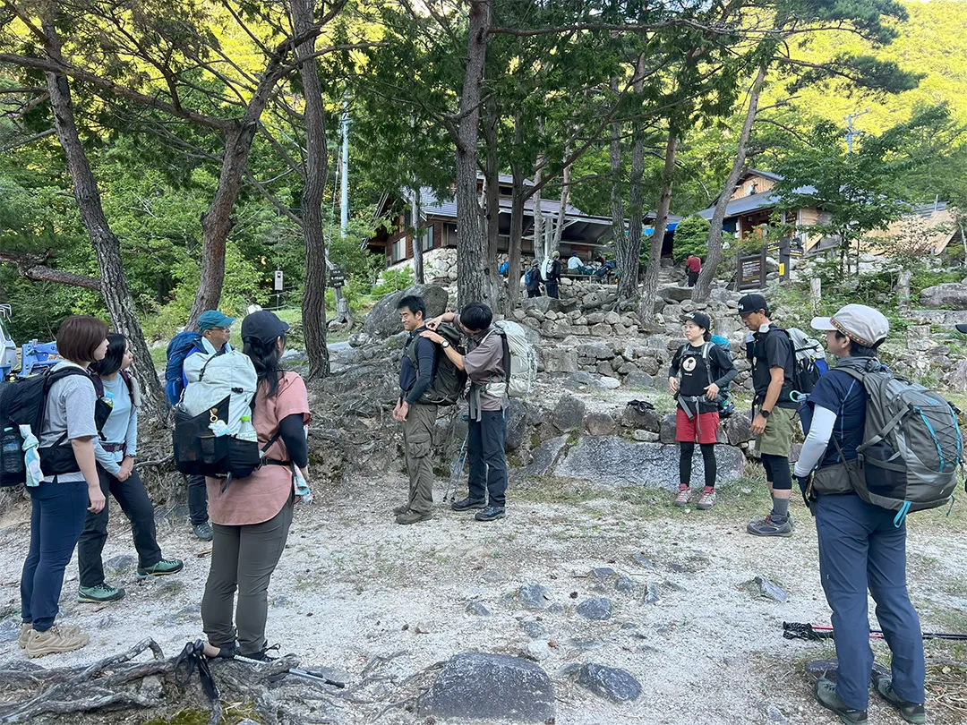 講師の伊藤伴さんから「ザックの正しい背負い方」や「靴の履き方とフィット感の大切さ」を学びます。ちょっとした調整で歩きやすく疲れにくくなることを教わりました。