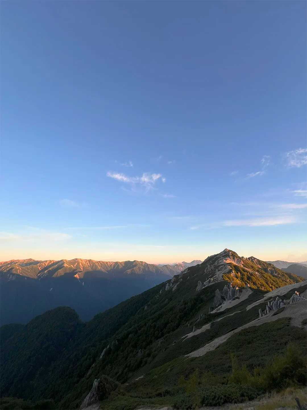 翌朝は、稜線全体が朝焼けに染まり、槍ヶ岳や周囲の山々が黄金色に輝く絶景に、言葉を失うほどでした。