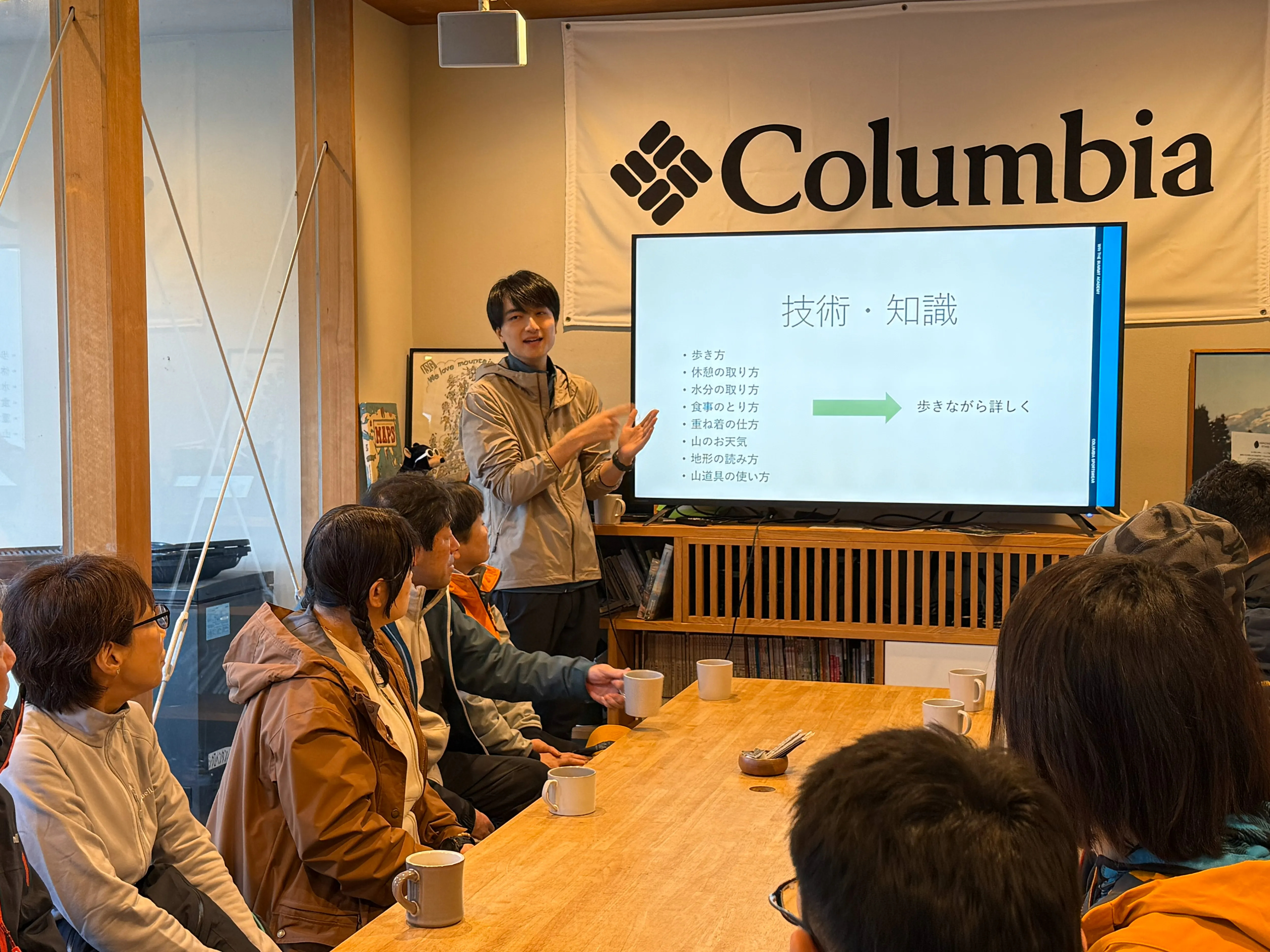 参加者の多くは登山初心者、もしくはこれから始めたいという方々。まずは登山口近くの「Mt.TAKAO BASE CAMP」にて、登山の基礎知識を学ぶ座学からスタートしました。ウェアやシューズ、バックパックの選び方・特徴、レイヤリングのコツなど、登山に必要な知識をしっかりと習得していただきました。