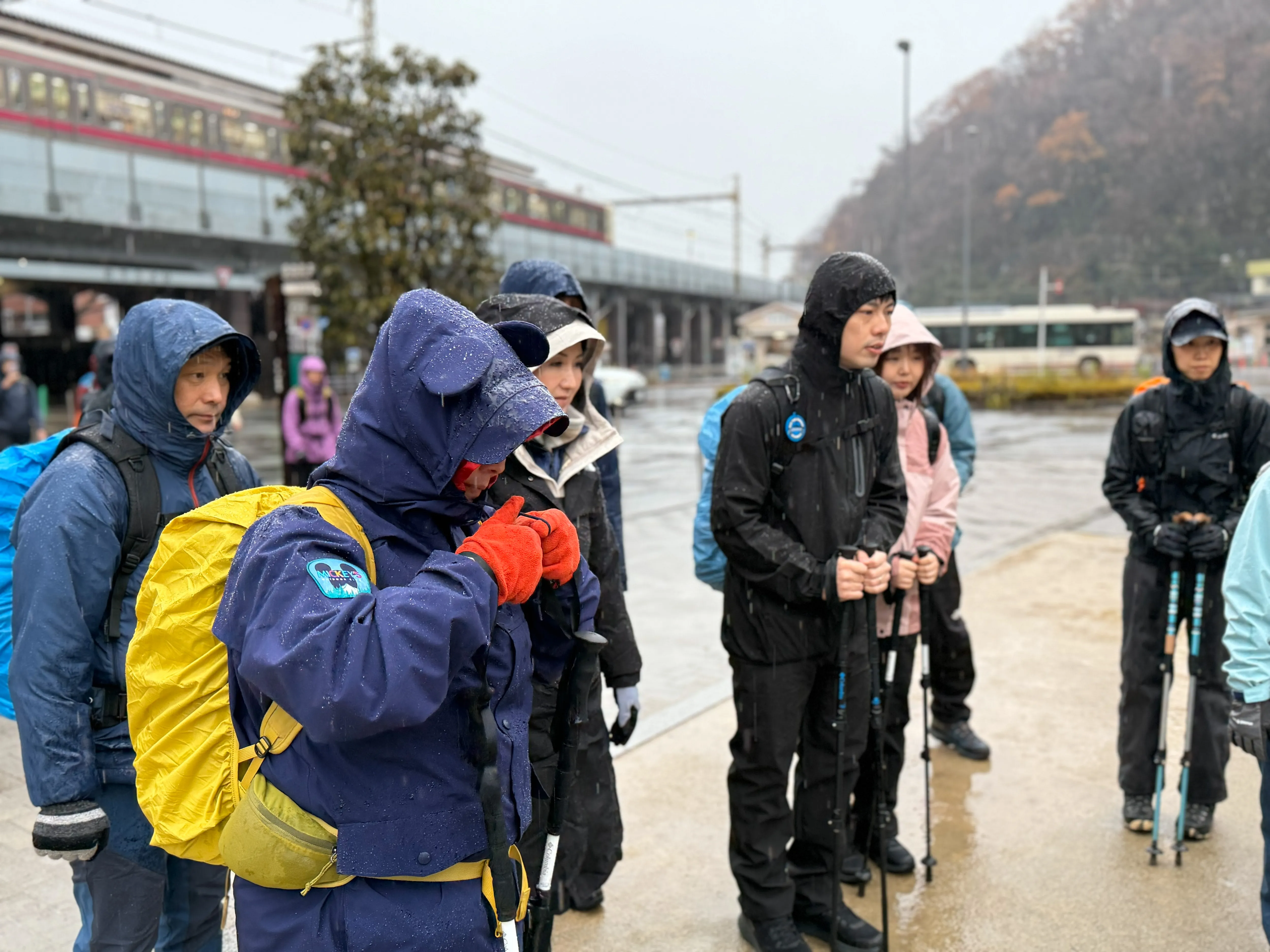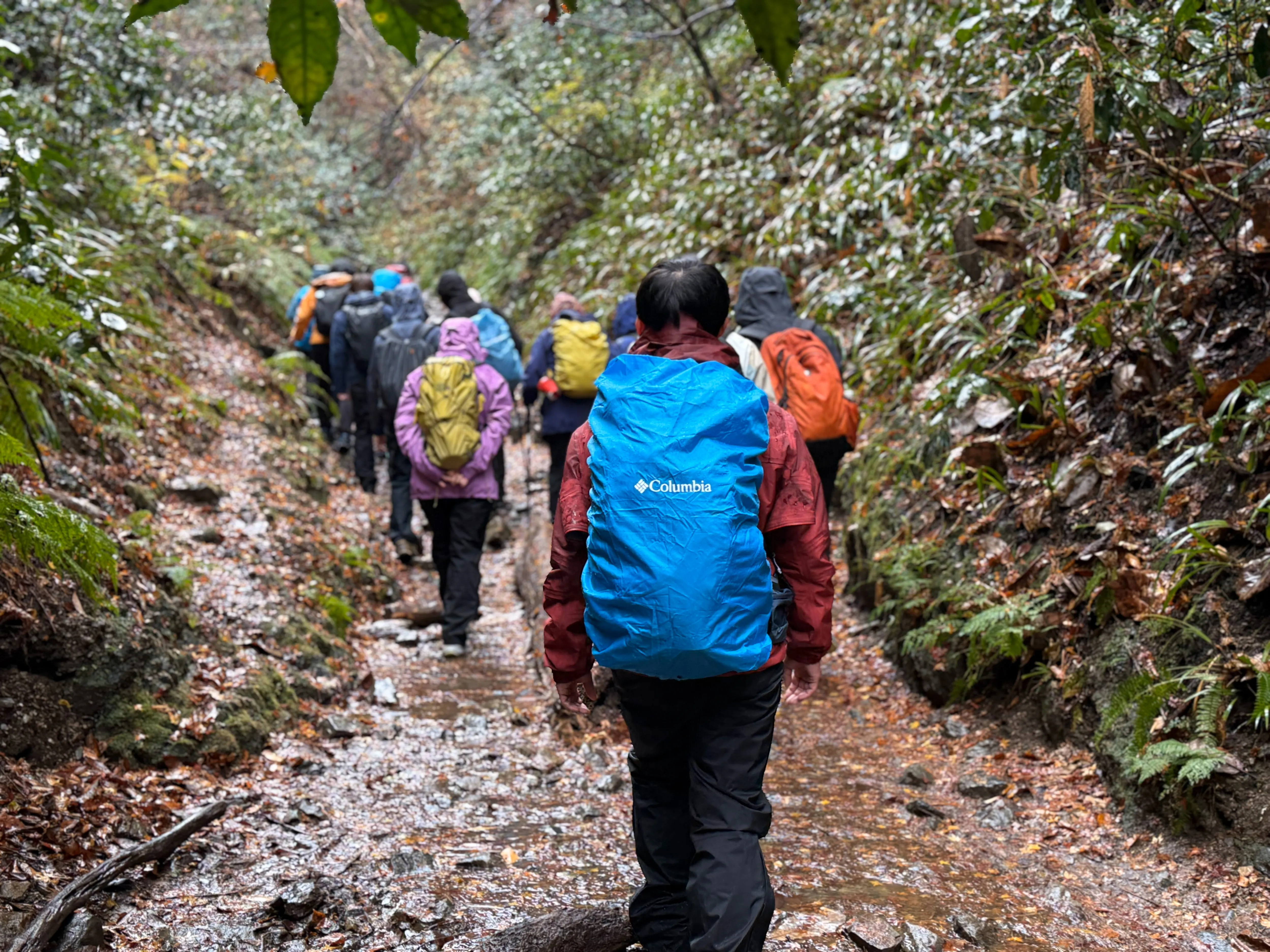 座学を終えた後、レインウェアやバックパック用レインカバーを装着し、6号路から登山を開始。滑りやすい路面での重心の置き方やポールの使い方など、雨天ならではの実践的な指導が行われました。