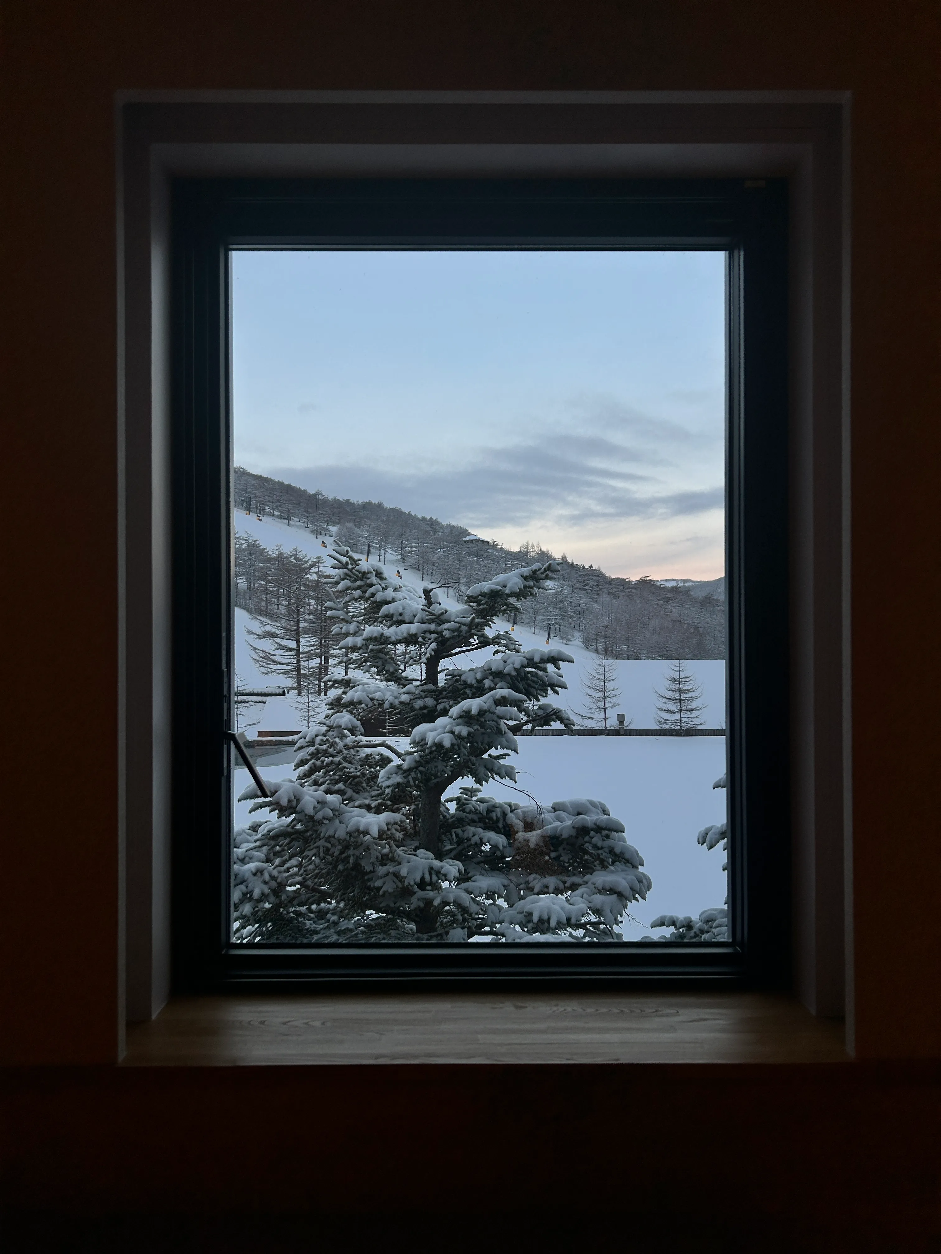 夜のうちに雪が積もり、朝日が見えて絵画のような世界が広がっていました。