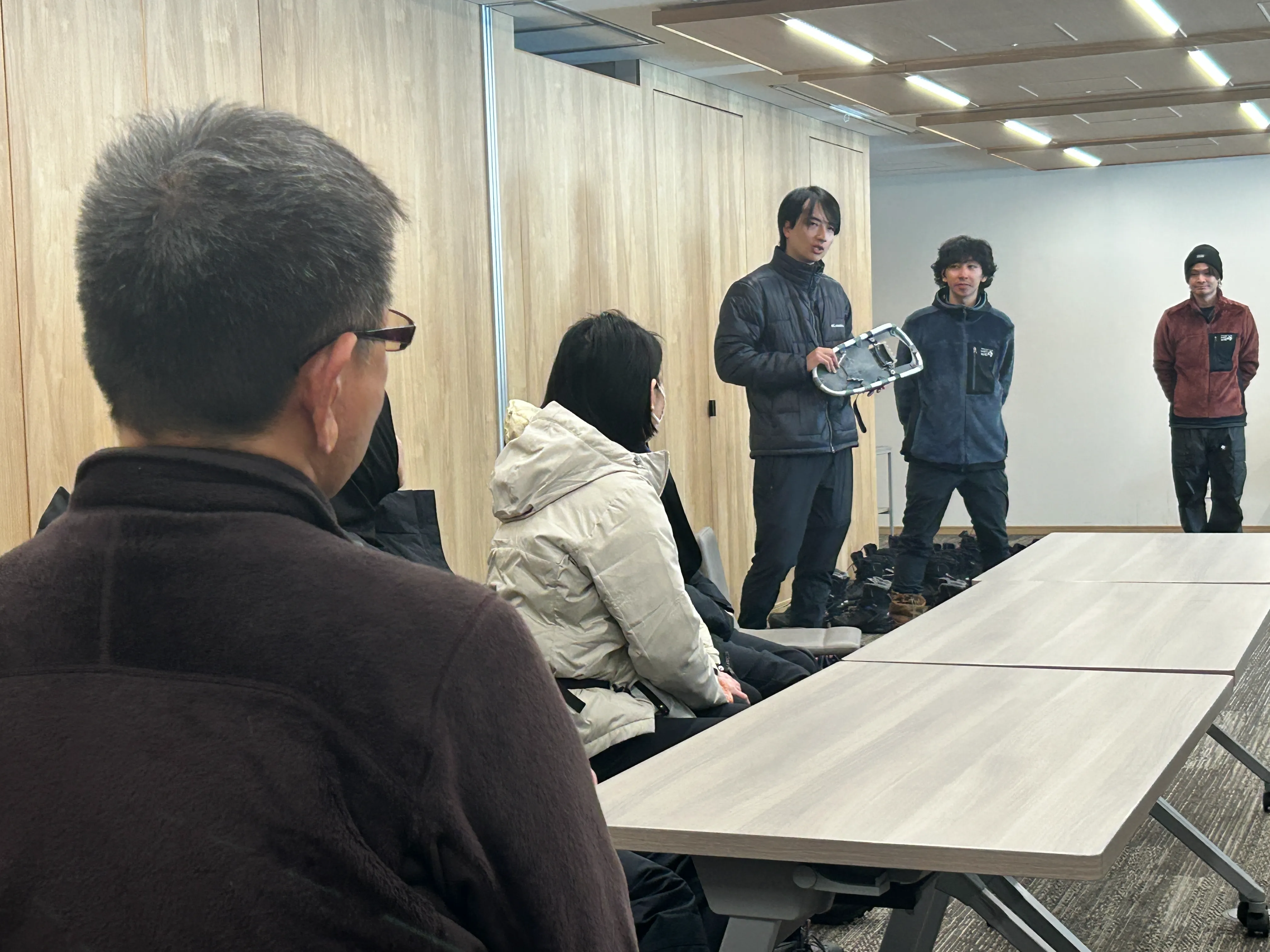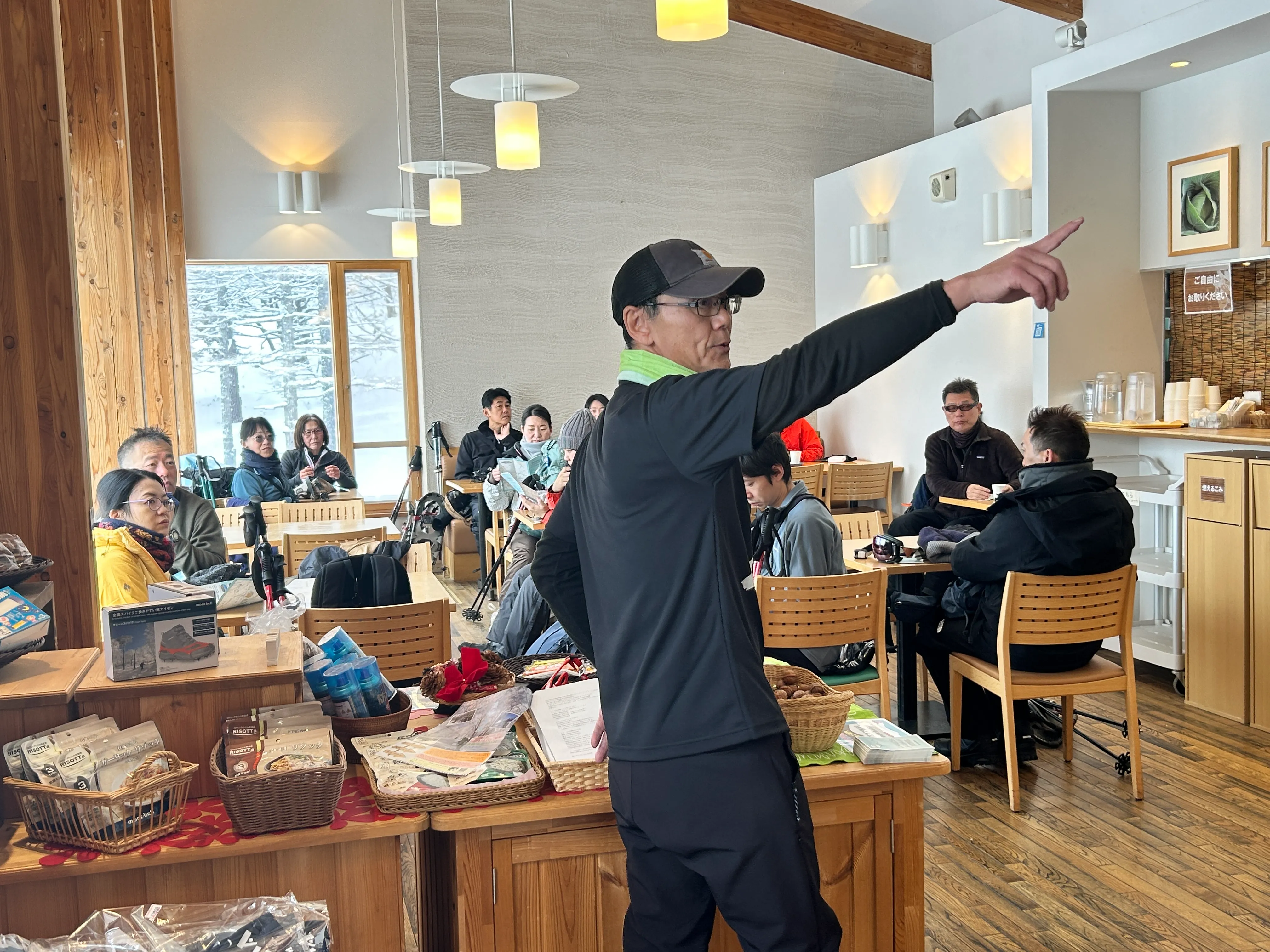 ホテルに到着したら軽く自己紹介をし、早速今回使う装備の確認をします。参加者の多くが、スキーやスノボはするものの雪の積もった山を歩くのは初めてという方々。初めて使う装備も多く真剣な眼差しで解説を聞いていました。