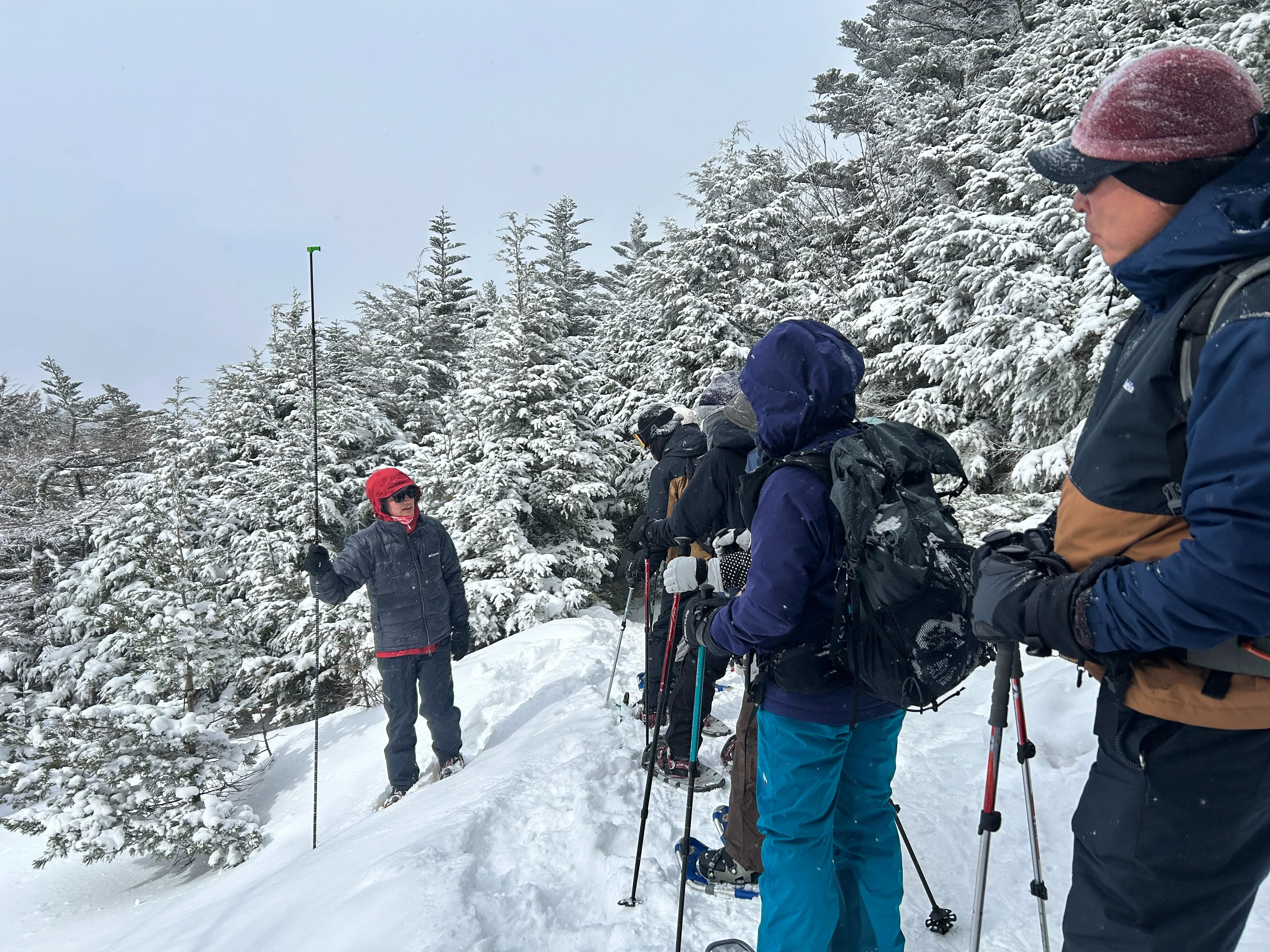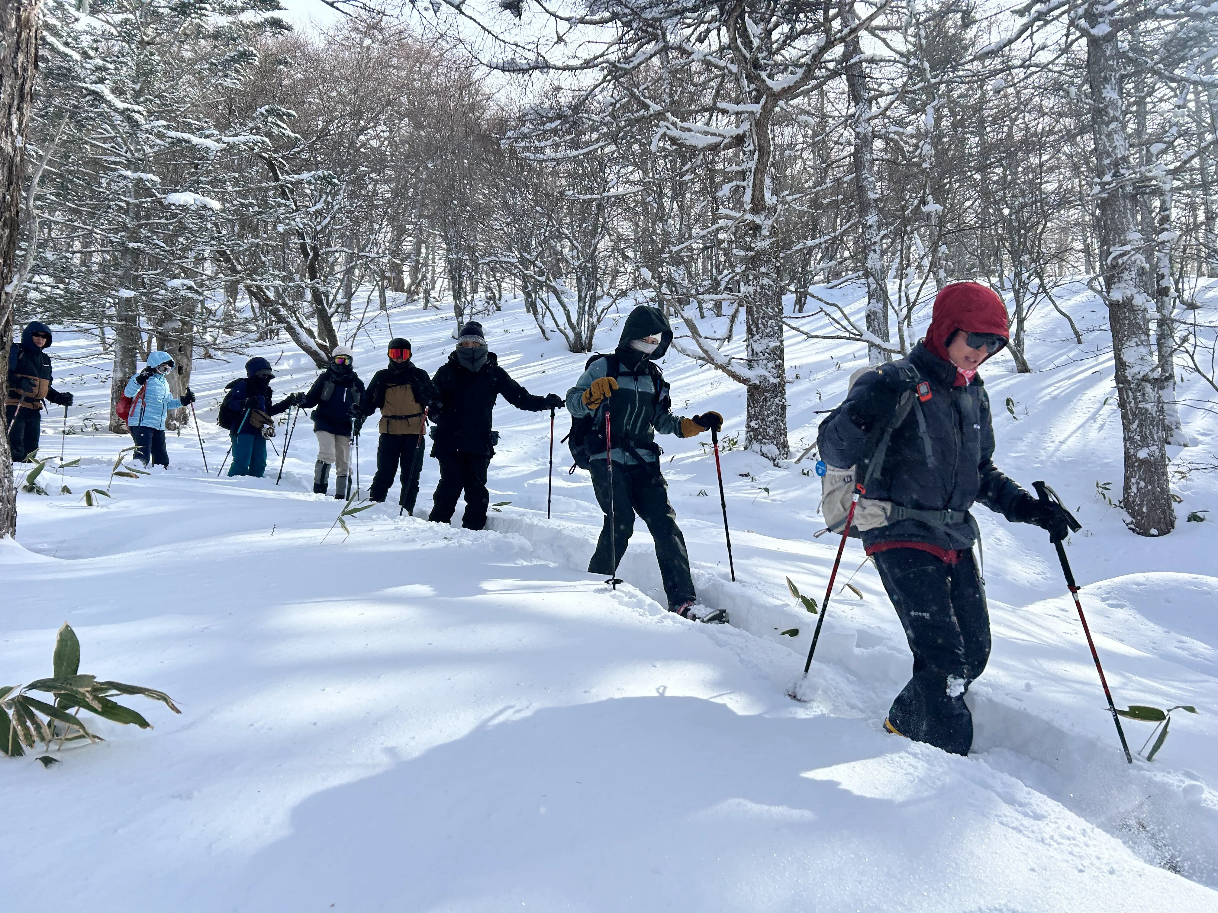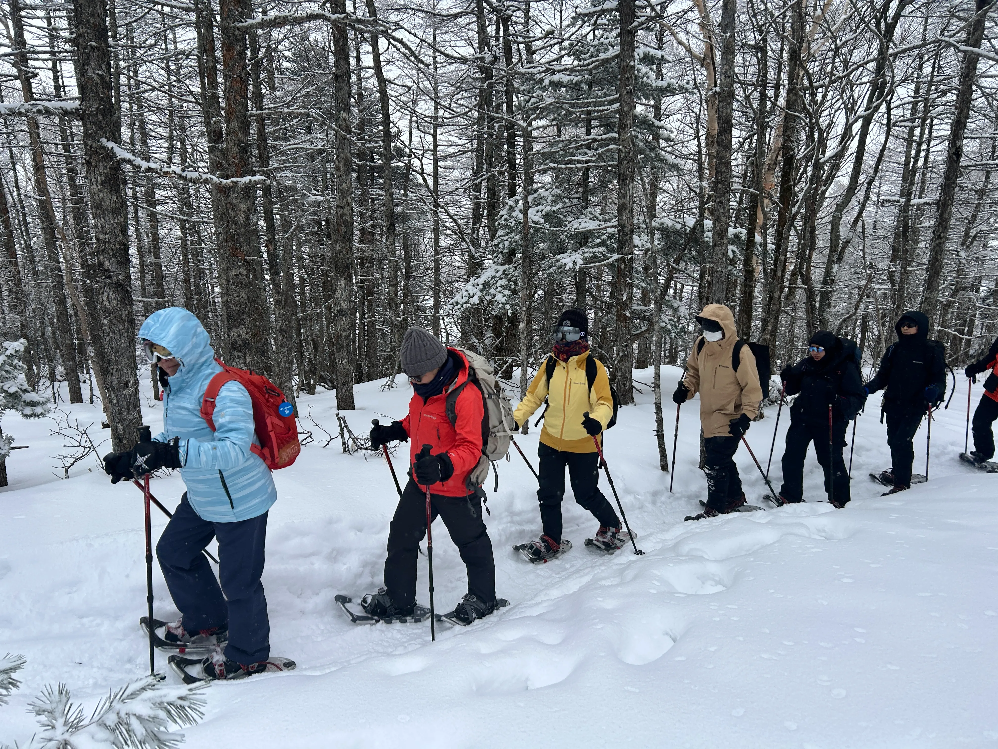 今回の登山学校では、抽選で選ばれた12名の参加者とともに、スノーシューを履き雪に覆われた森を楽しみました。