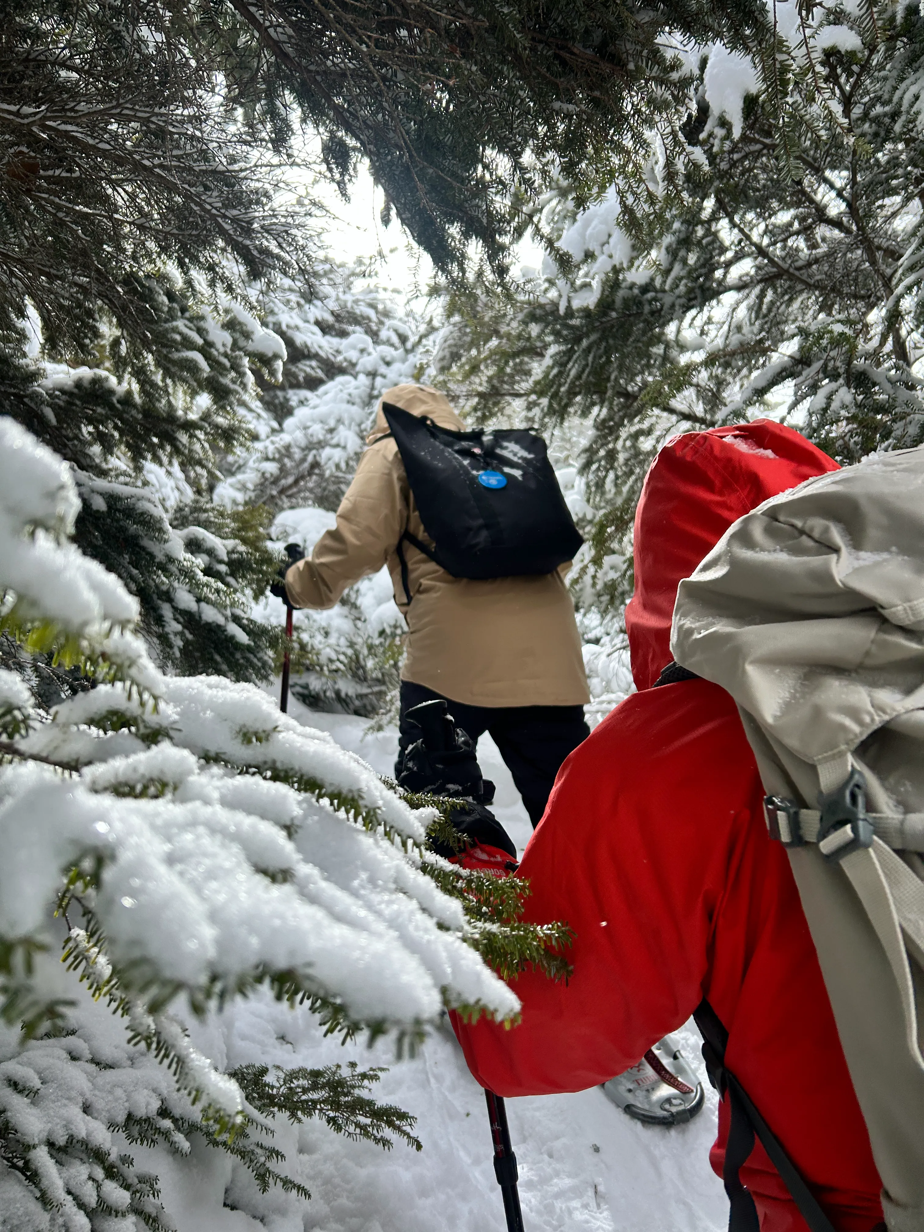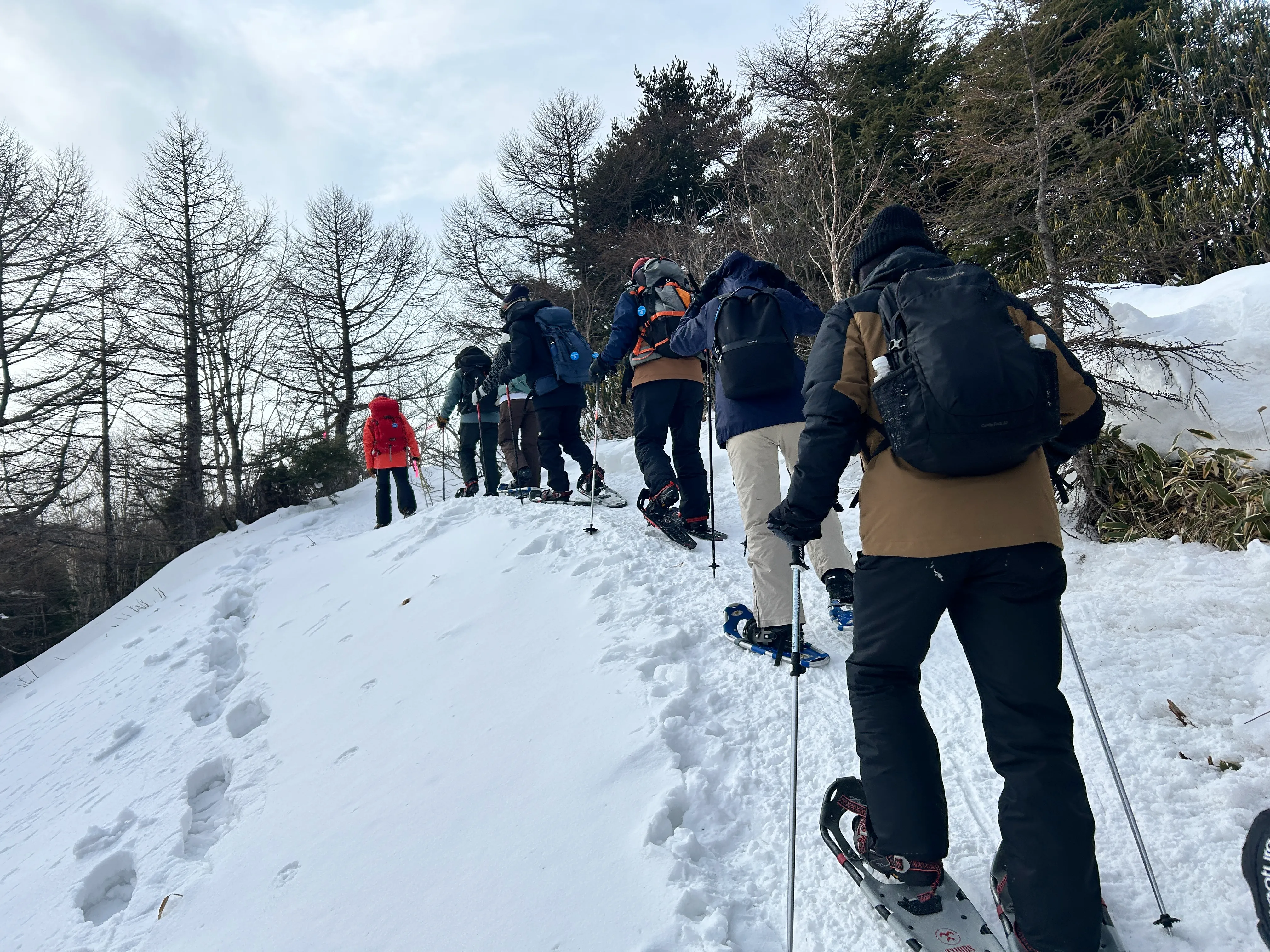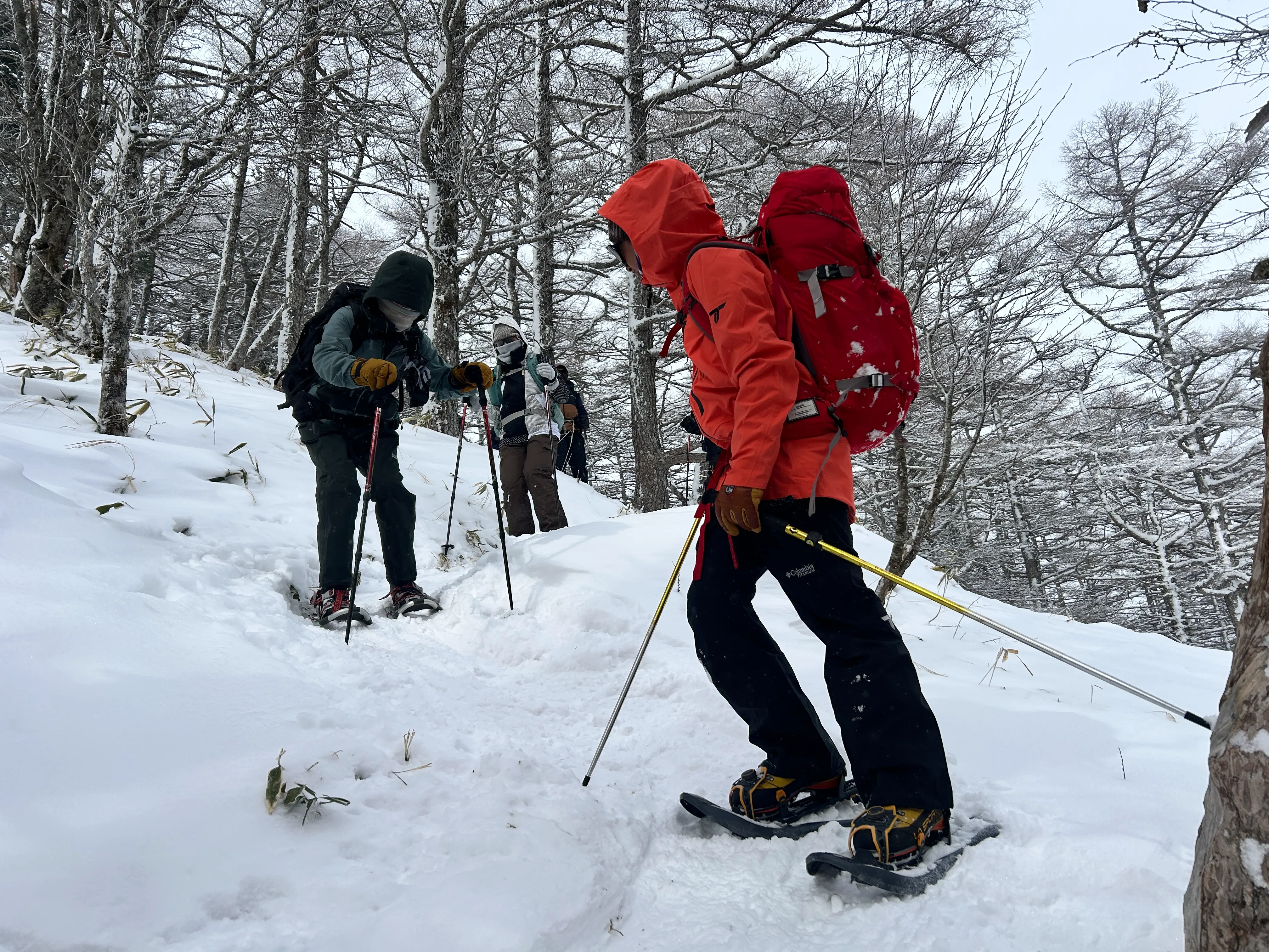 緩やかな登りから始まり、徐々に勾配が大きくなっていきました。クランポンと呼ばれる、スノーシューの裏についた爪を意識し斜面に踏み込んでいきます。足を上げすぎず、引き摺るように進むのもポイントです。