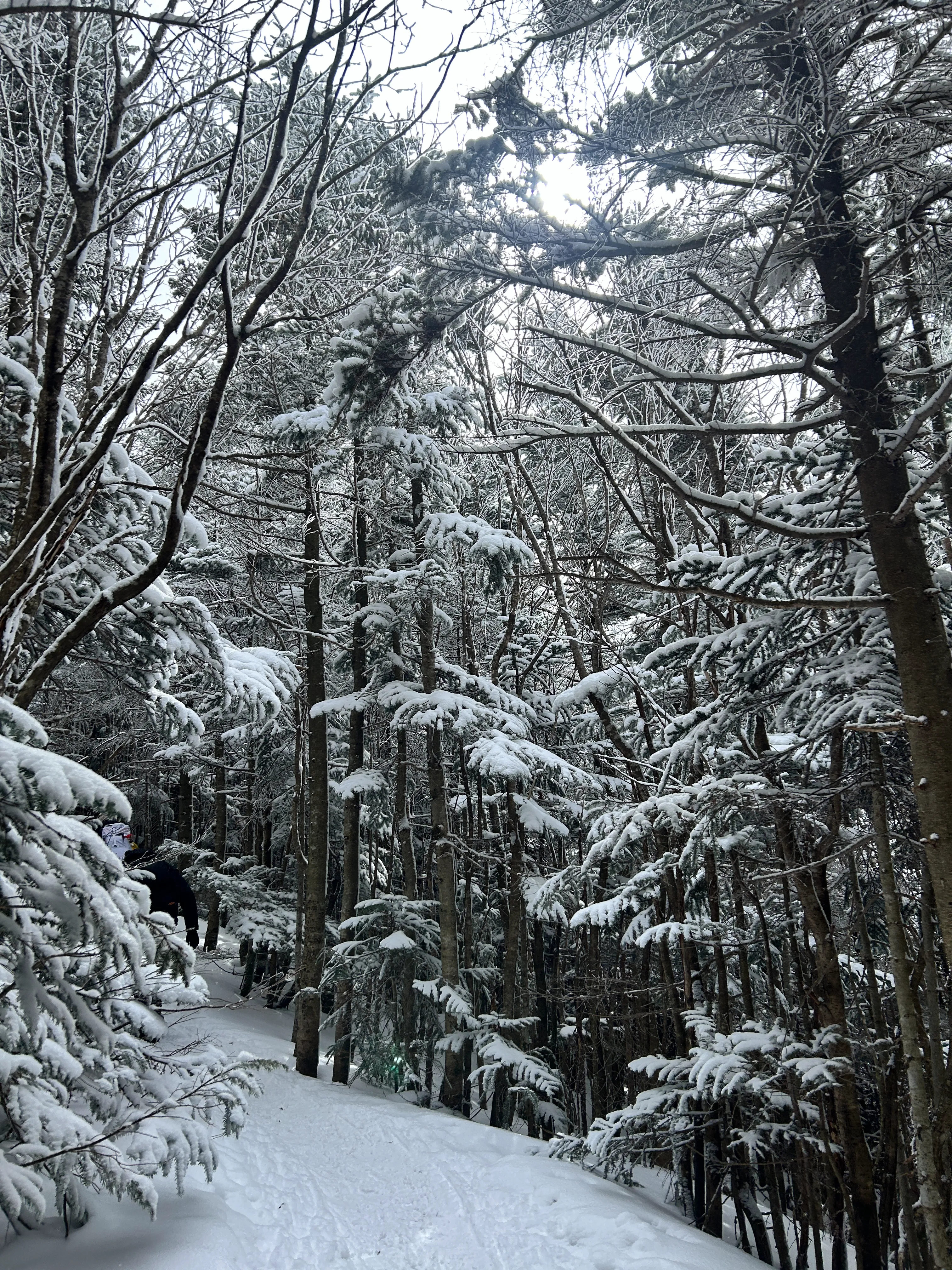 白に包まれた森は、夏には見ることのできない幻想的な世界。たまに立ち止まっては日の光に照らされてキラキラ輝く木々を観察します。
