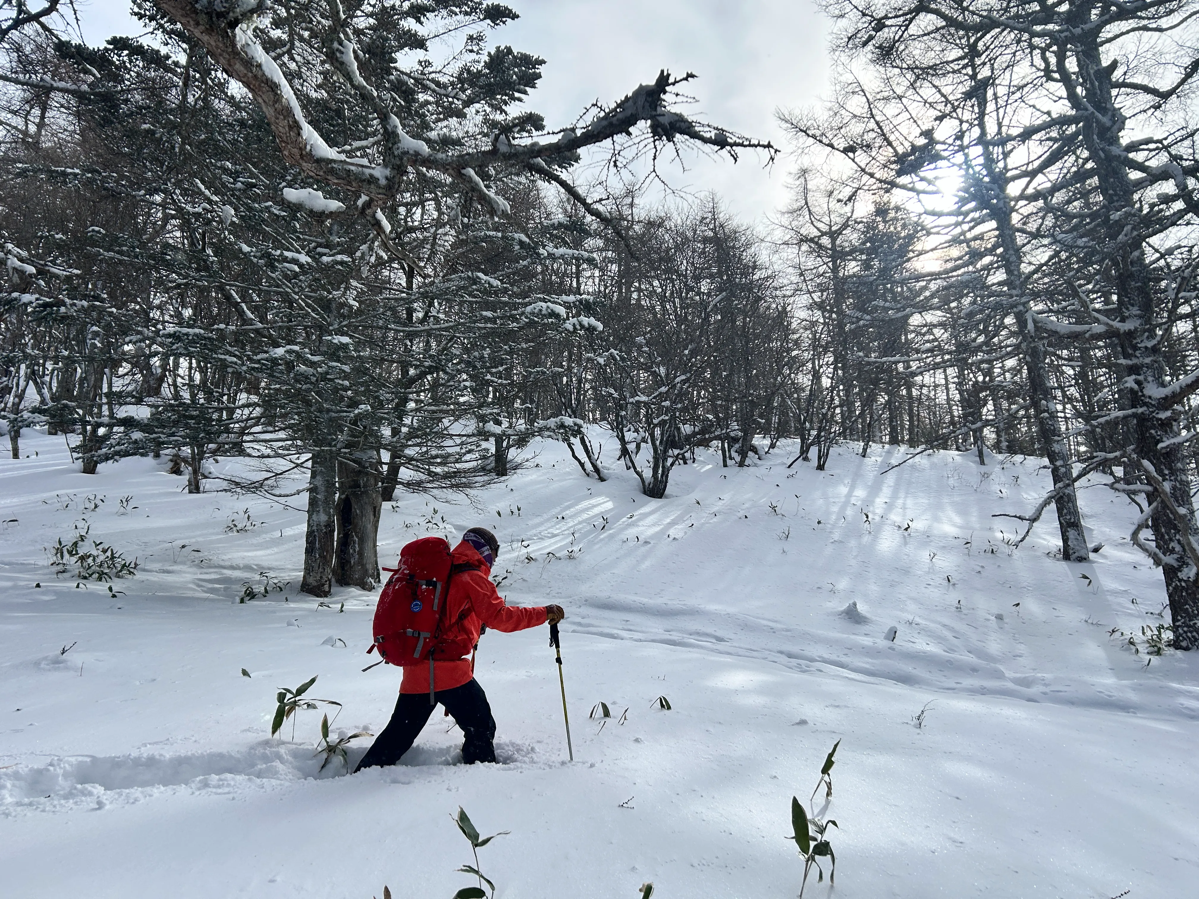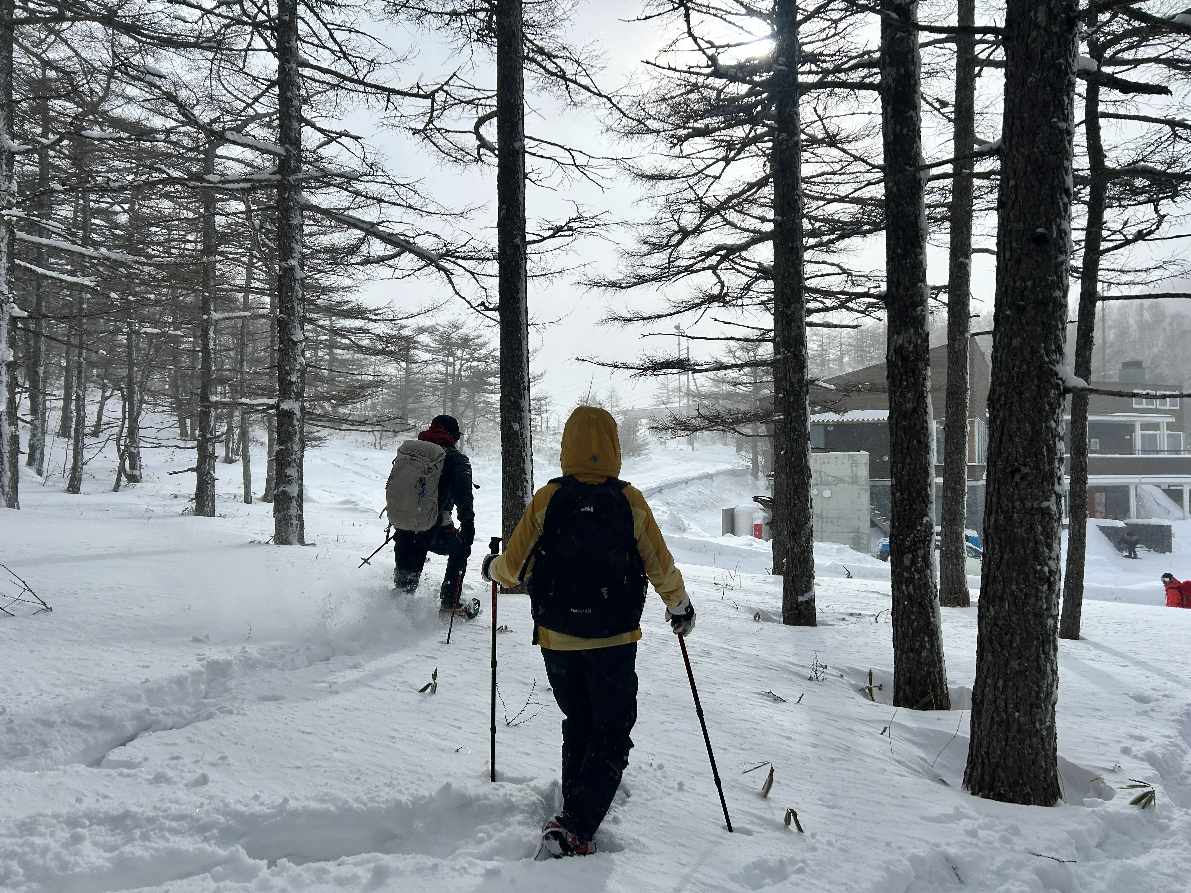 下りの際は車坂山を登らずトラバースするルートに変更。ガイドの2人がラッセルをして道を作ってくれました。新しくできた道はとても柔らかく、沈む感覚もまた雪の上でしか味わえないものでした。