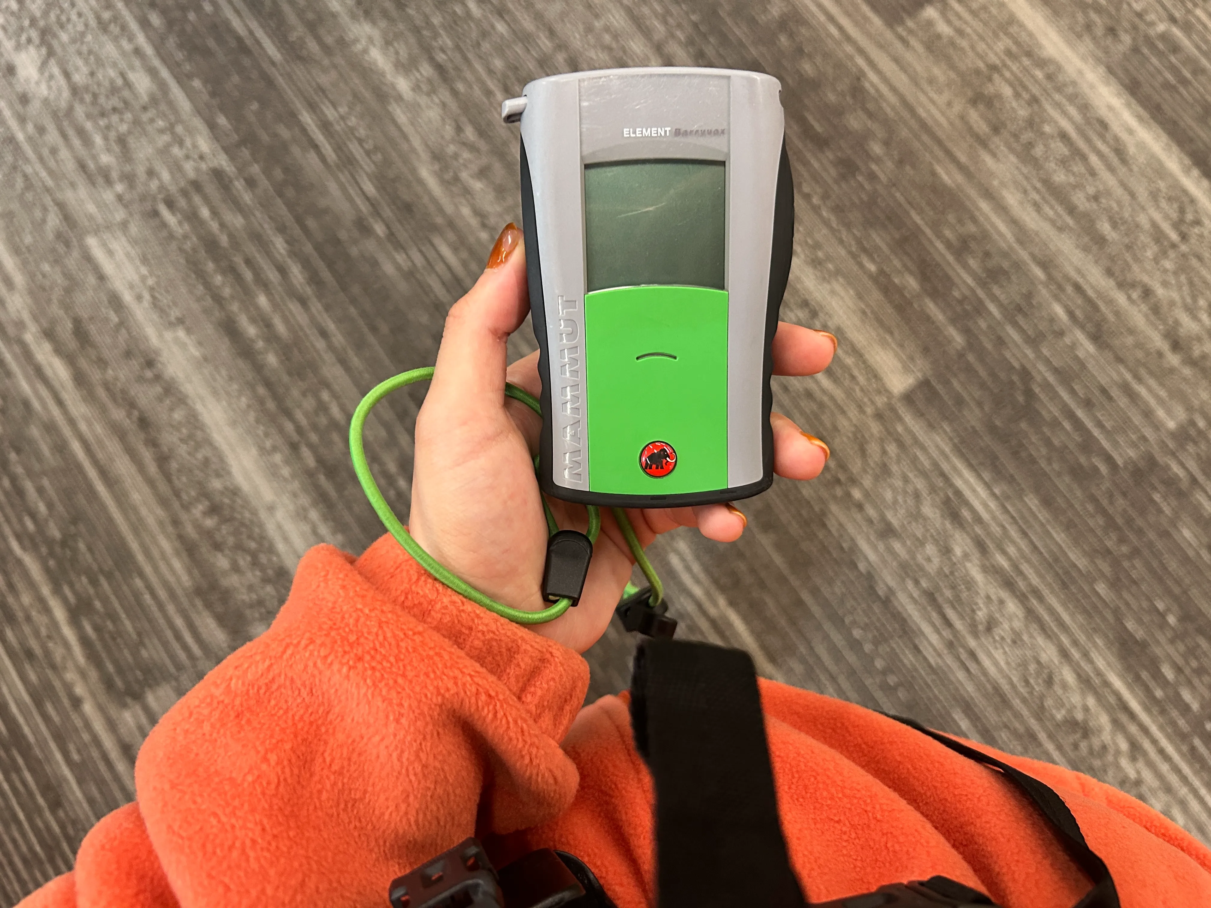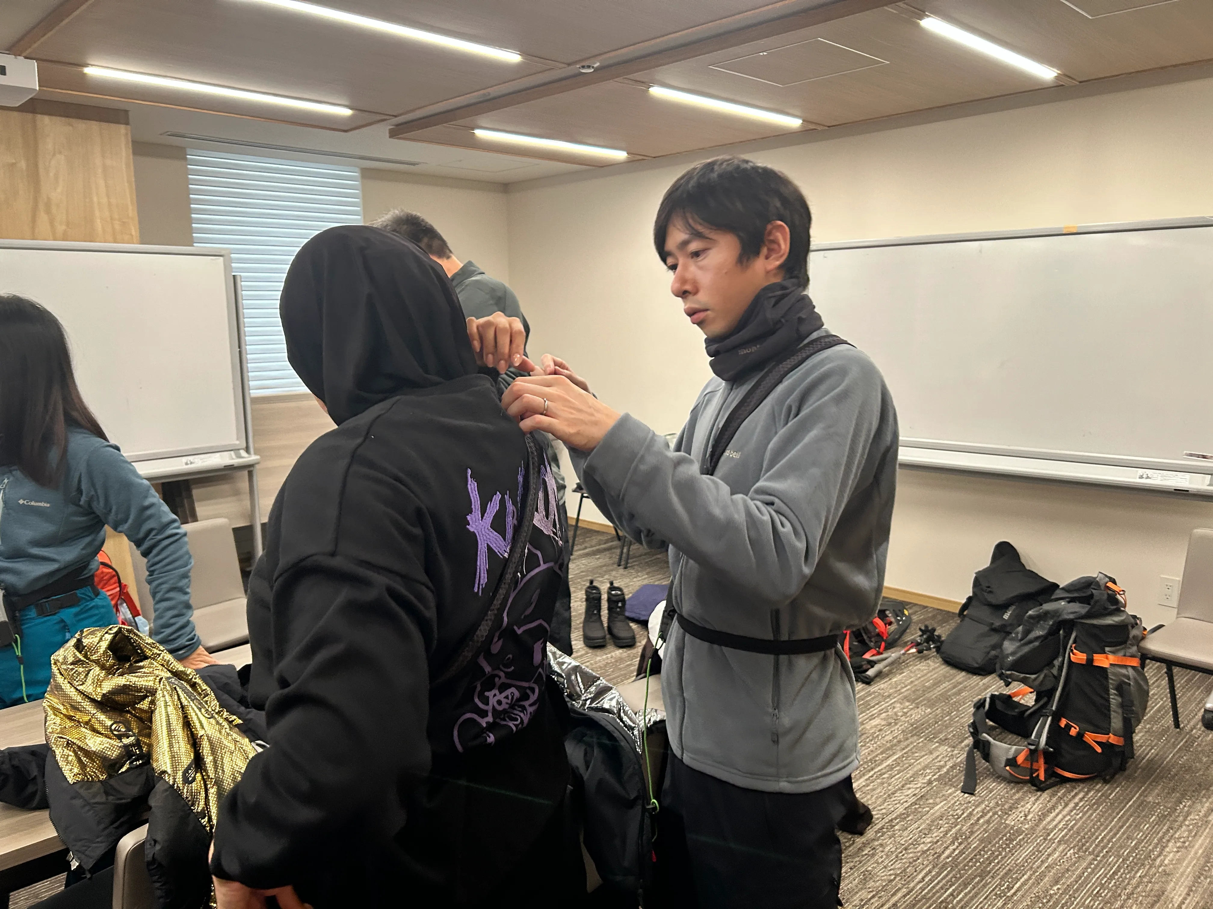 ビーコンは雪崩が起こった際に電波を用いて位置情報を送受信し、埋没者を捜索するためのアイテム。正しい装備の仕方や使い方を教えてもらい、参加者同士で確認し合いました。
