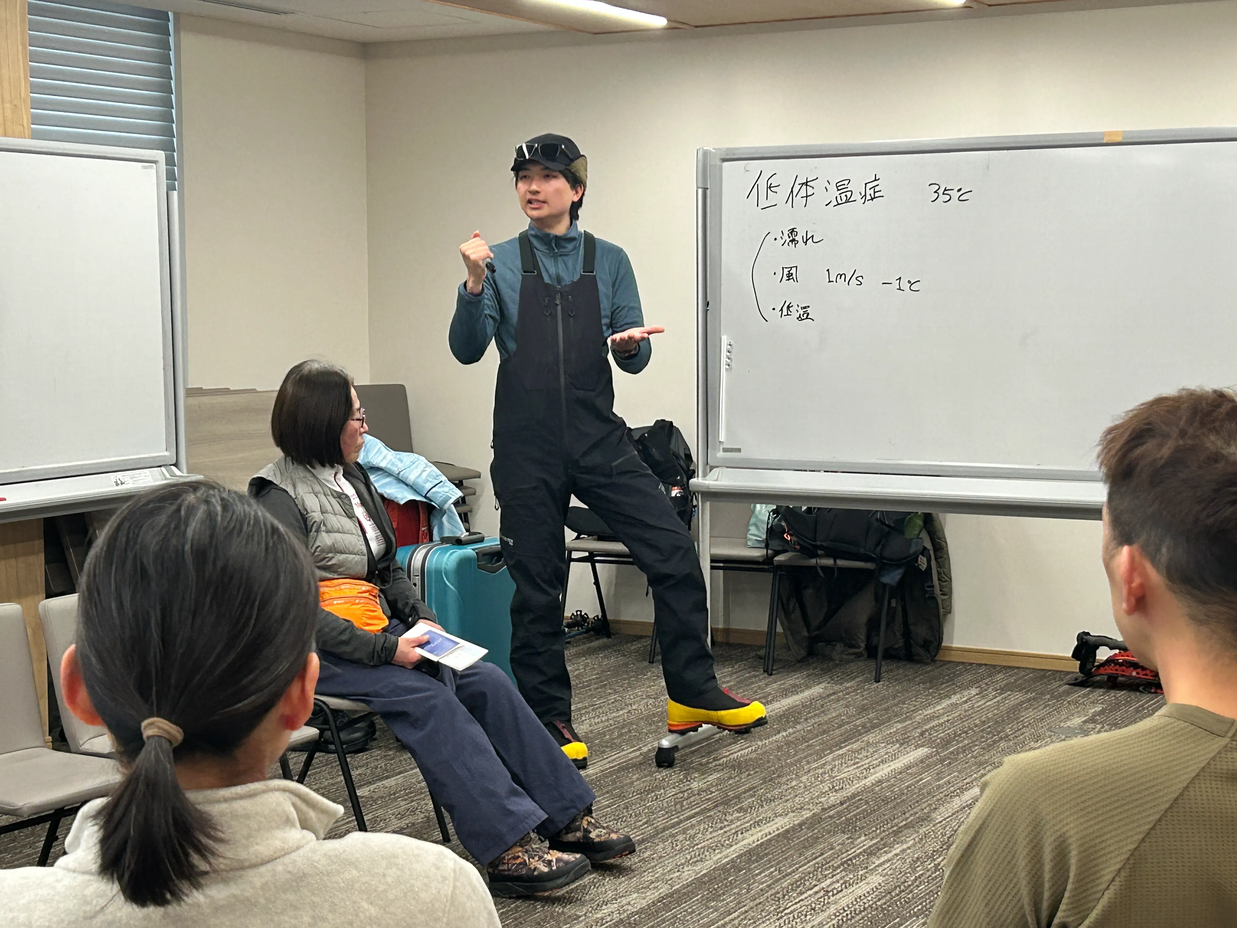 本日のトピックは低体温症について。どんな環境でなり得るのか、陥らないためにはどんなレイヤリングをすべきかなど、具体的な体験談を交えつつ参加者の皆さんと考えました。冬山は特に、気温が低く着脱も億劫になりやすい一方汗は必ずかいているので、レイヤリングを意識することが重要となります。