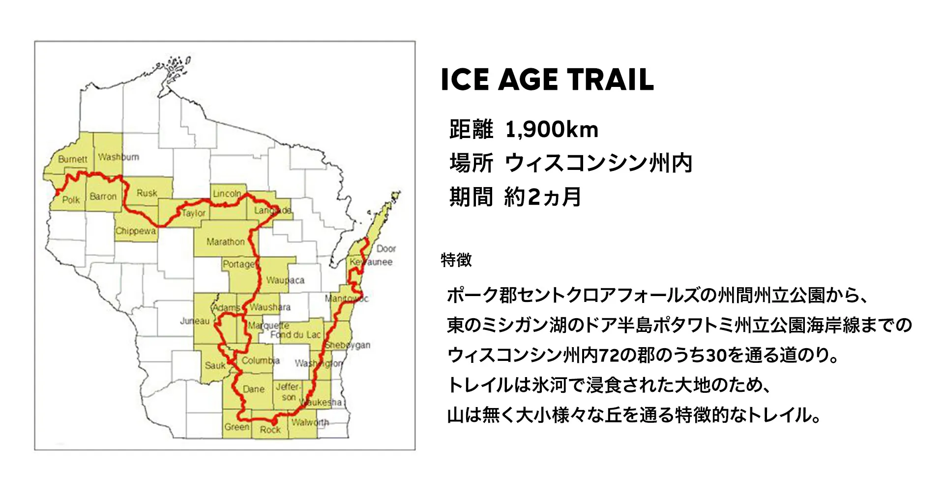 今回、斉藤さんが選んだ舞台は、アメリカ・ウィスコンシン州を走るアイスエイジ・トレイルだ。アメリカのナショナル・シーニック・トレイルのひとつで、全長約1,200マイル(約1,900km)。最終氷河期に形成された地形をたどる道である。「これまでシーニックトレイル全踏破を目指して歩いてきて、残りは後5つ。そのうち一つはすごく短いからいつでも良い。残る選択肢は4つあるけど、どれもめちゃくちゃ長いんですよね」