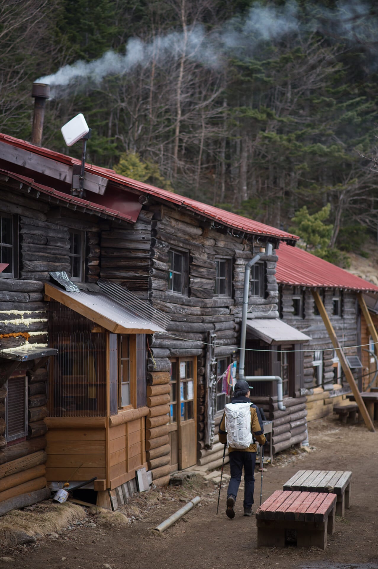 丸太づくりの甲武信小屋。引き戸を開けると、小屋番さんの暖かな声と薪ストーブの爆ぜる音、そしてカレーのいいにおいが迎えてくれた。