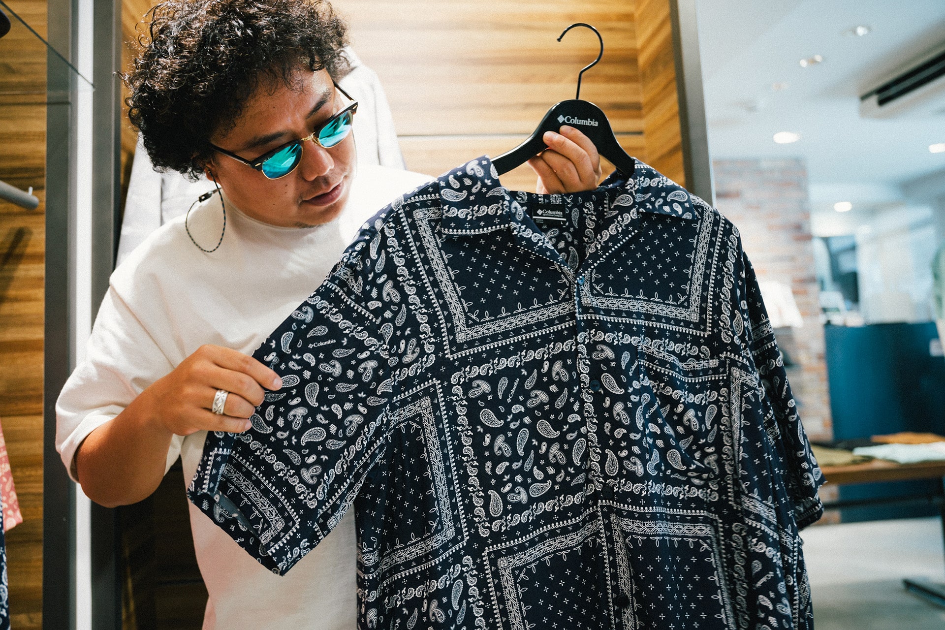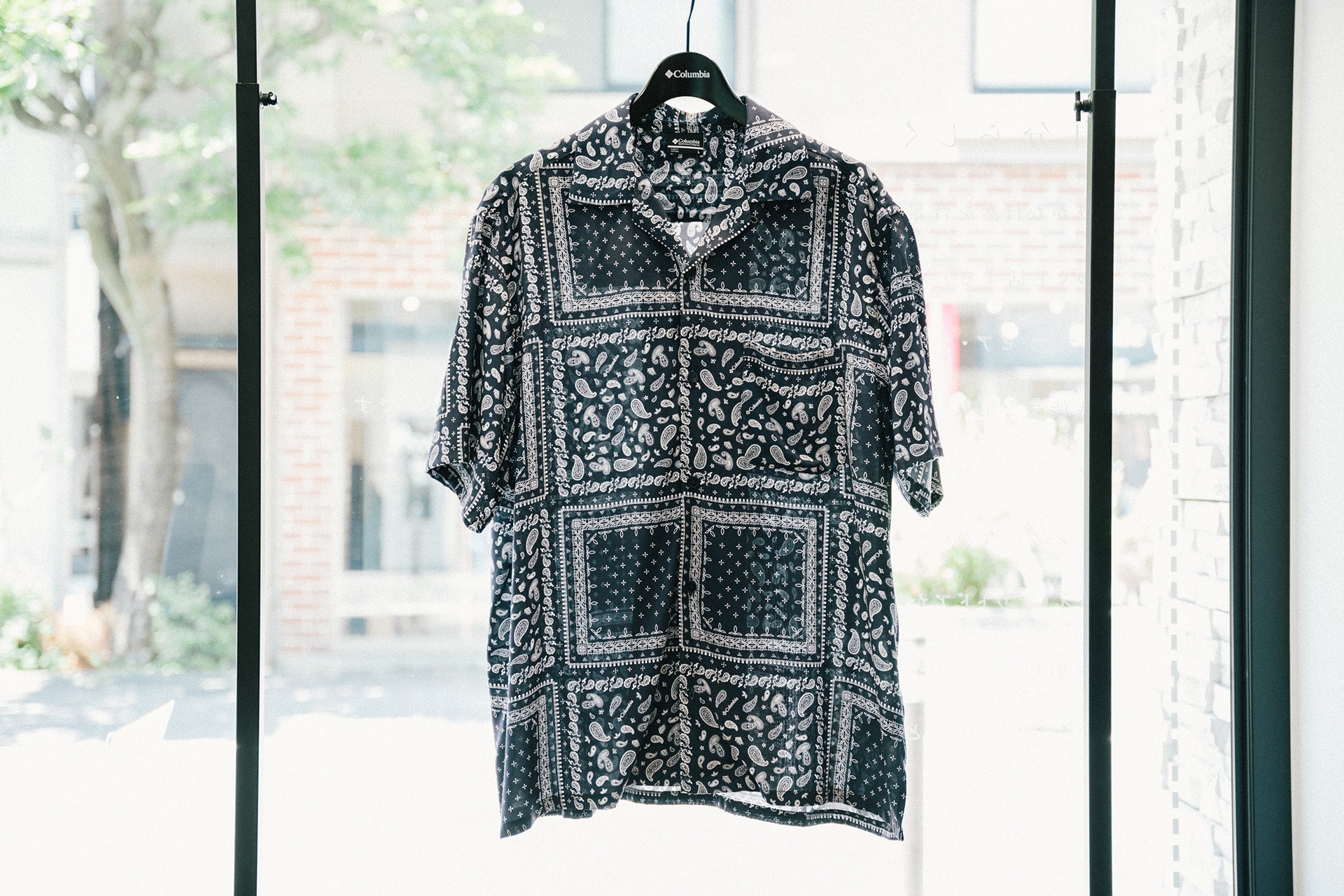「これは素材がサテンじゃなくてレーヨンなんですね? あとパッと見るといわゆるバンダナ柄ですけど、近づくと、柄の中に小さめにコロンビアさんのロゴも混じっているのがいいですね。なんか僕さっきからシャツばっかり見ていて“あいつシャツ好きだな”って言われそうですね、ハハハ!」