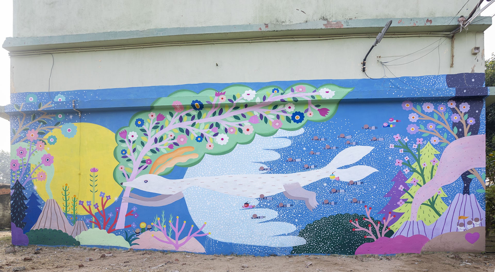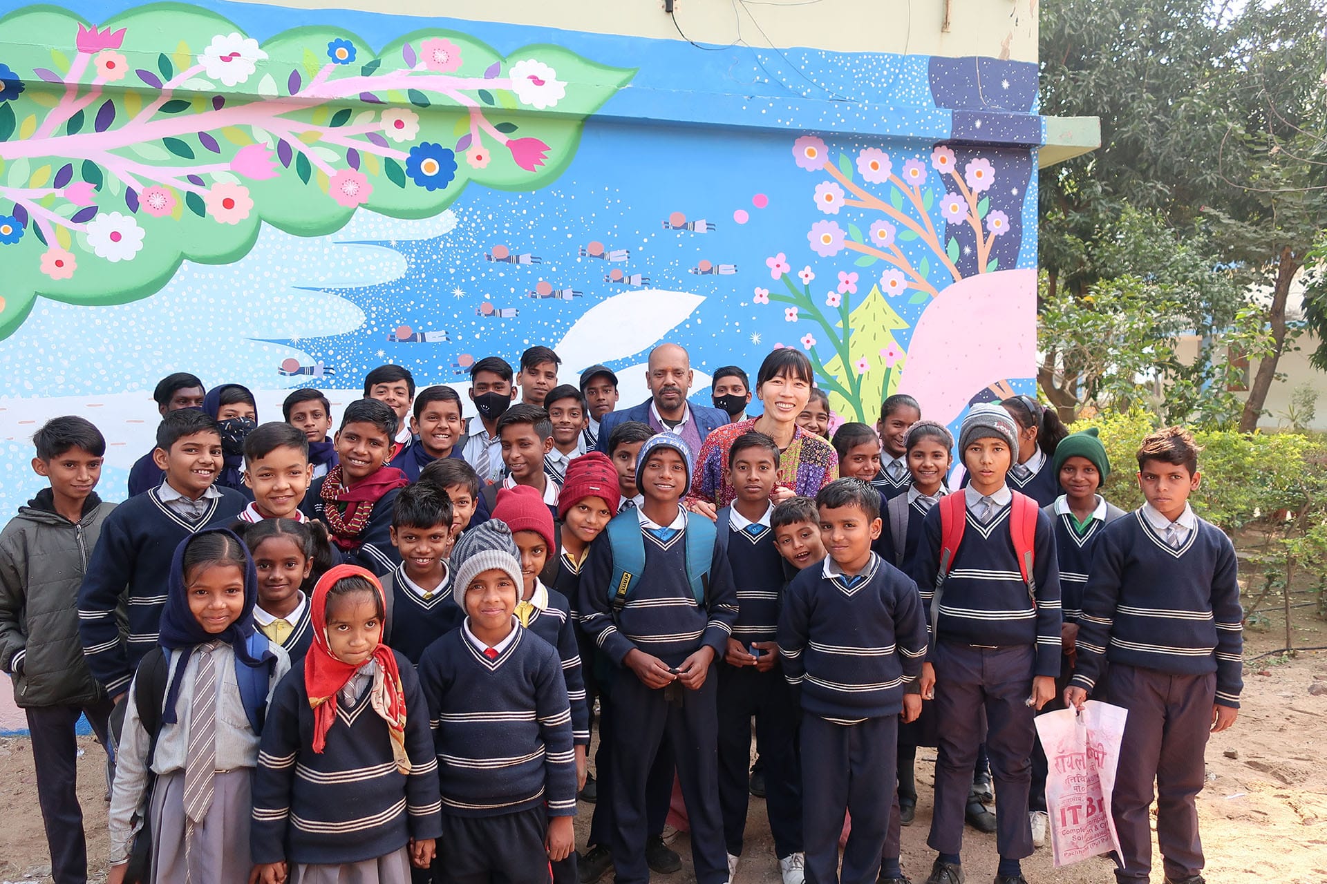 「最高に楽しかったですよ。青をベースに不思議な動物の絵を描きました。最終的には全生徒に参加してもらったので、子どもたちも喜んでくれたと思います。インドはいい感じでユルくて、授業を抜け出してくる子がいても先生は叱らないんです。そればかりか、私が教室をのぞきにいくと、教壇に呼ばれて日本語を教えてくれってなって。子どもも大人も人懐っこい感じに触れていたら、そのままインドに住みたくなりました」