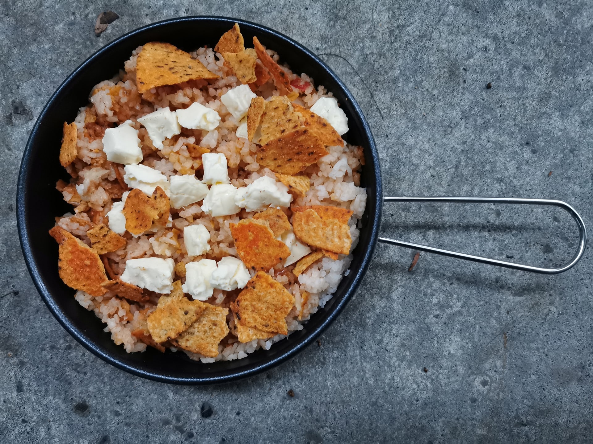 ▲希望食品の白飯に、トマトソースパウダーとチーズ・トルティーヤチップスを砕いて入れたメキシカン風ピラフ