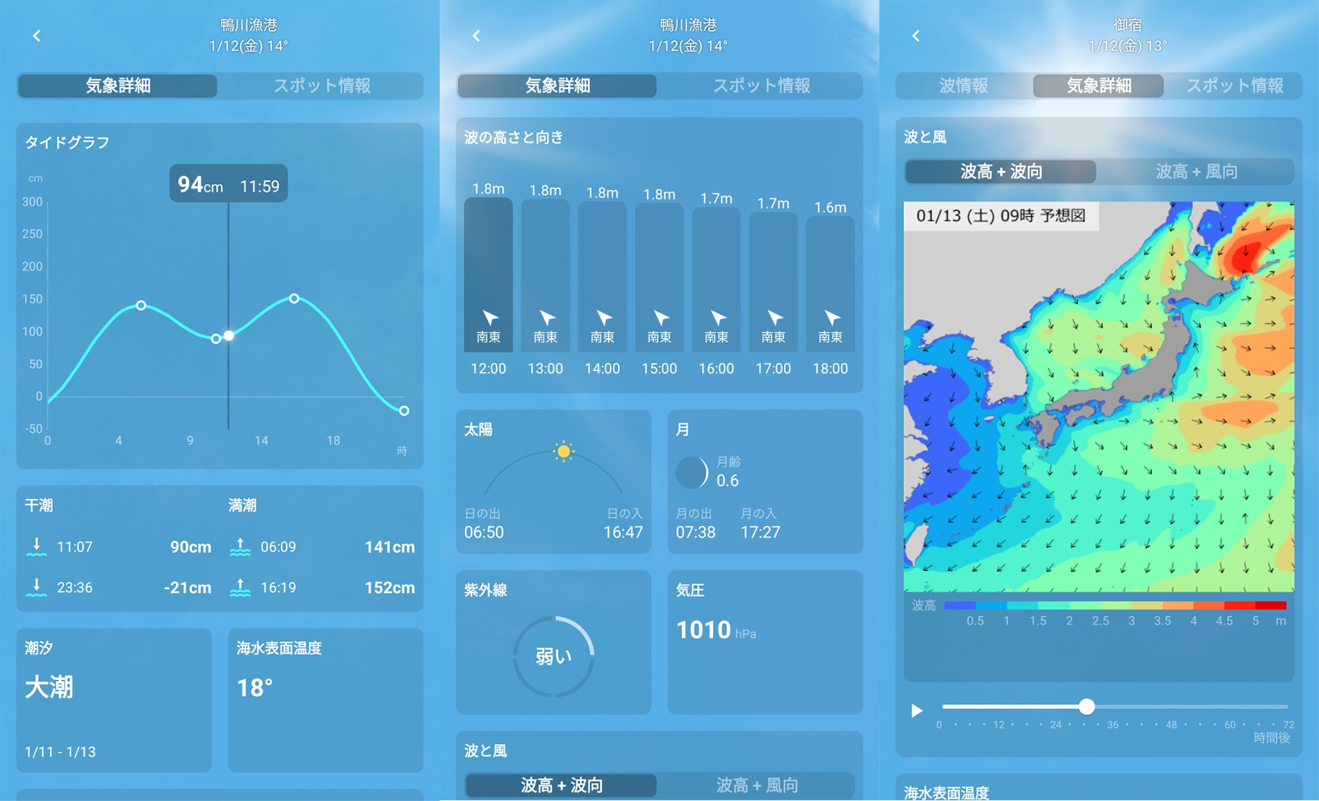 7日間の天気や1時間ごとの天気といったスタンダードな情報に加えて、日の出入りや月の出入り、UV指数、気圧、実況天気図などの詳細な気象情報もチェック。海のアクティビティに関しては、タイドグラフや満潮・干潮時刻などの情報も確認することができます。さらに、約7,500件のアウトドア関連ショップ(サーフショップ、ゴルフショップ、スキー&スノボショップ)も検索できるため、寄り道の参考にも!