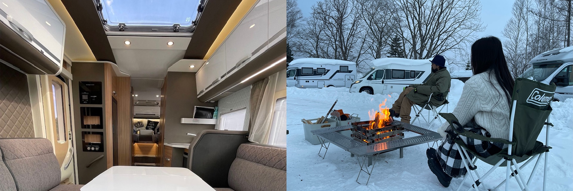 最高峰であるアドリアマトリックスの最新車は、広々とした内装に冷蔵庫・床暖房・テレビやフル装備のキッチン、快適なベッドルームを完備し、その充実ぶりはまるで高級ホテル。現在は千歳空港営業所にて貸し出しをするプランと、ニセコで宿泊体験をするプランの2種類を実施中。後者は最高のロケーションの中で、有料オプションで焚き火サービスやテントサウナ、“かまくら”作りなどのアクティビティを楽しむこともできます。