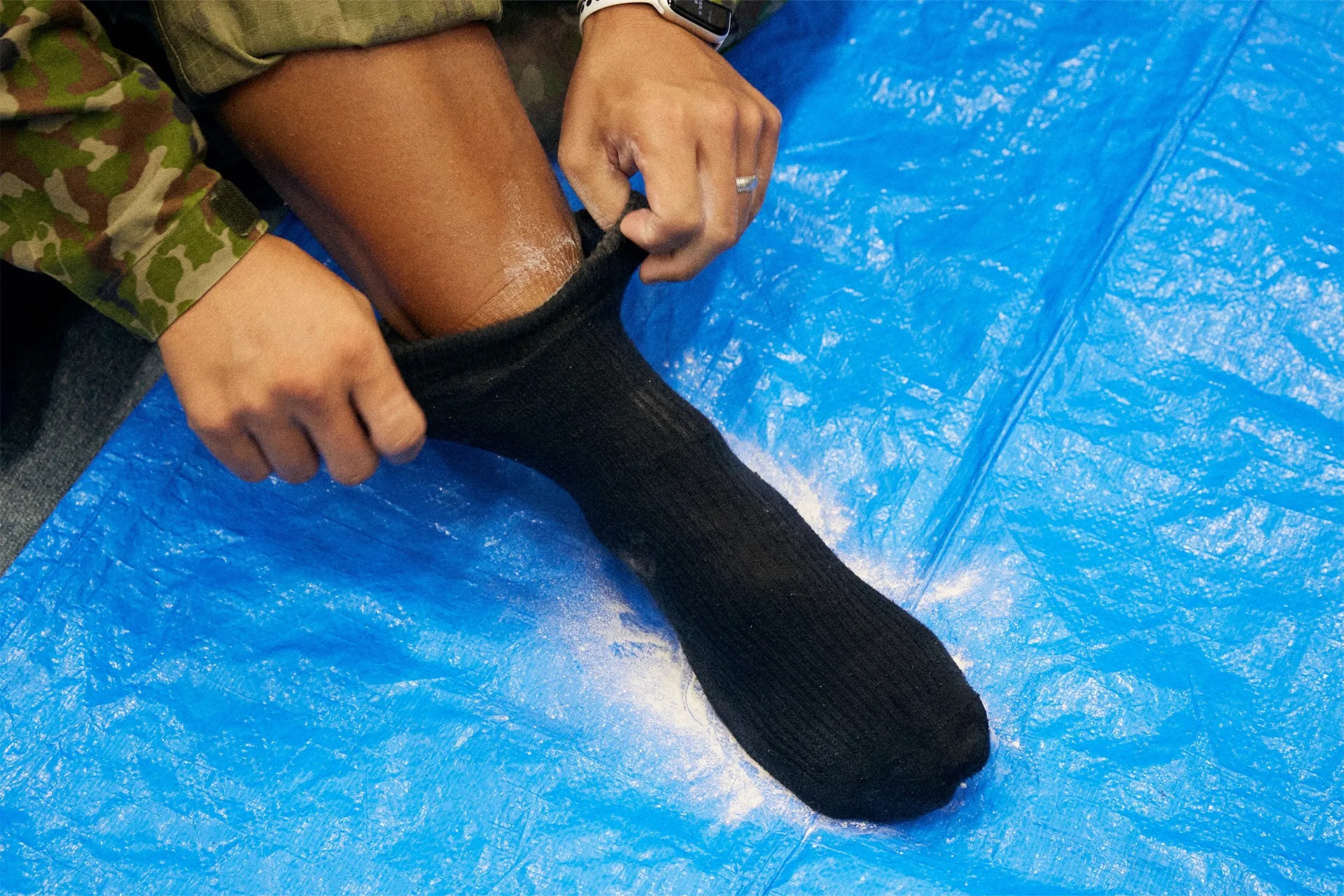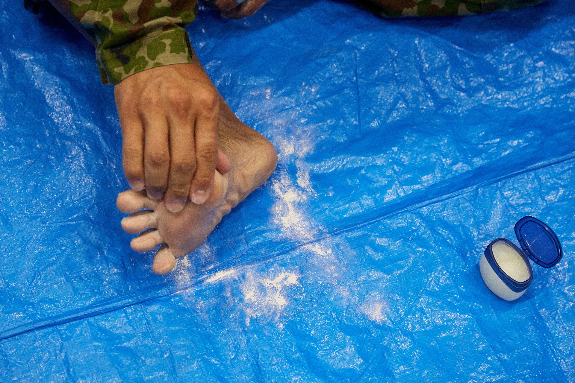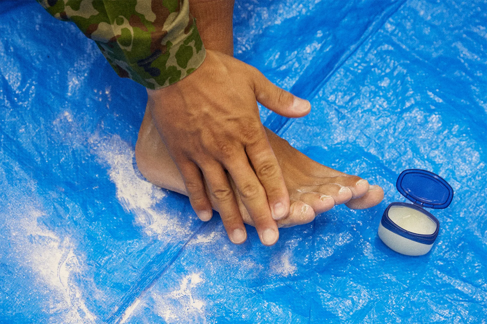 3.靴擦れが起きやすい部位(足の外側、裏、指のあいだ、かかと)にワセリンをたっぷり塗る