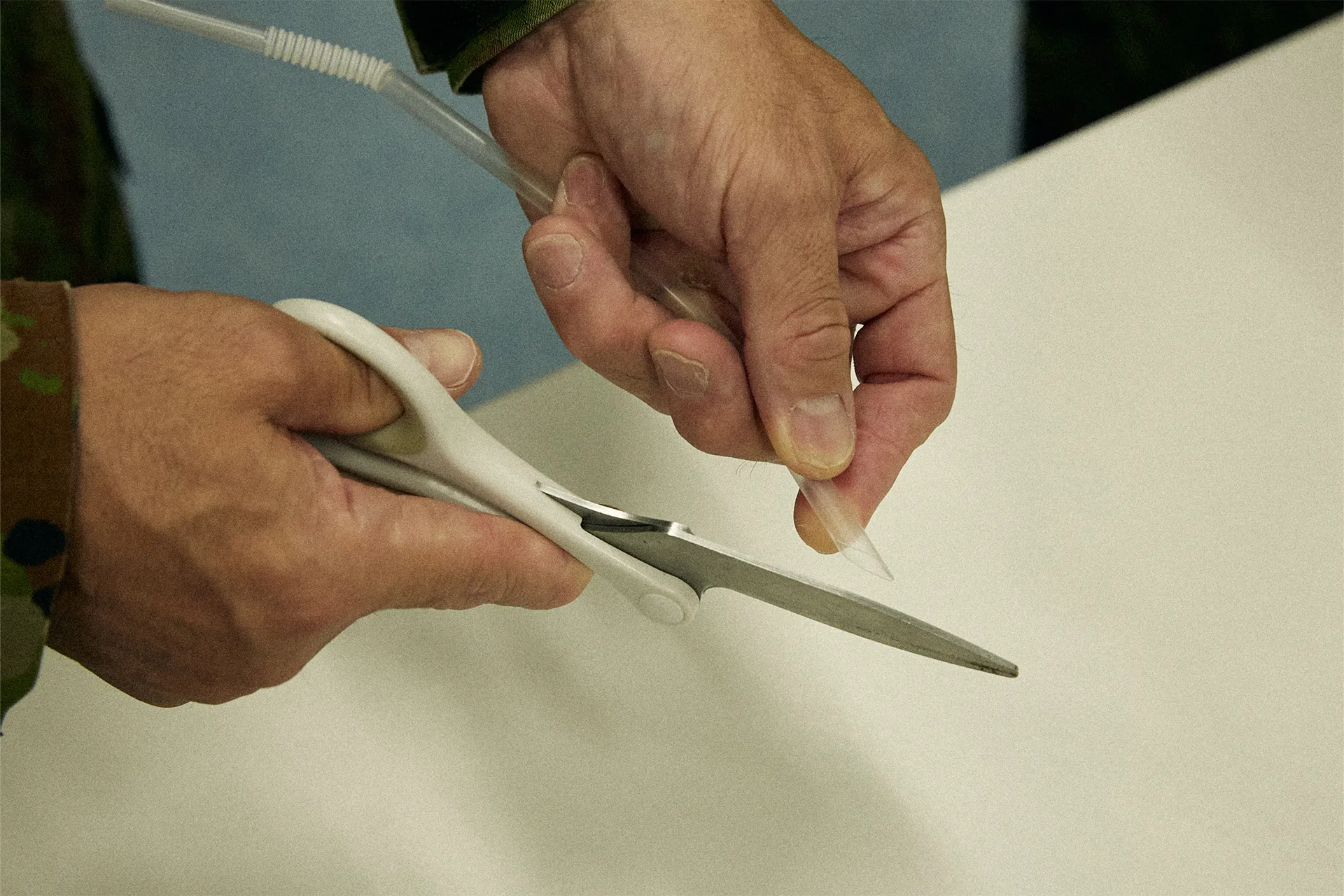 ペンをぐるぐると回して締めつけ、圧迫止血を行う
