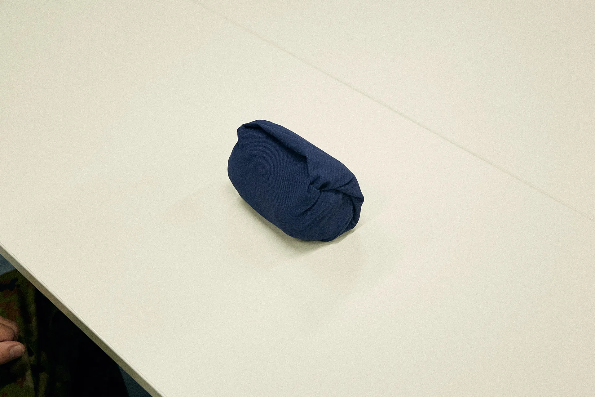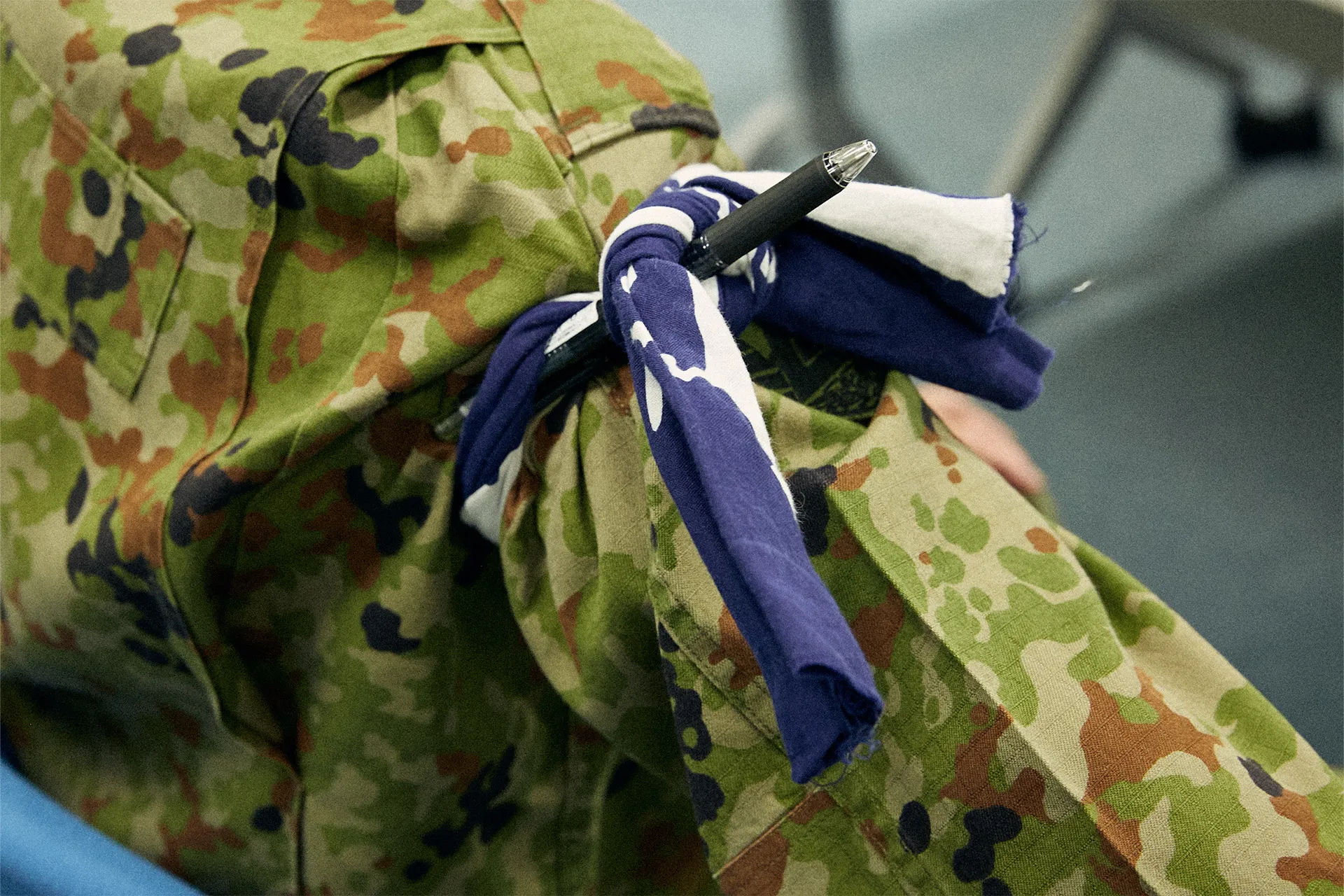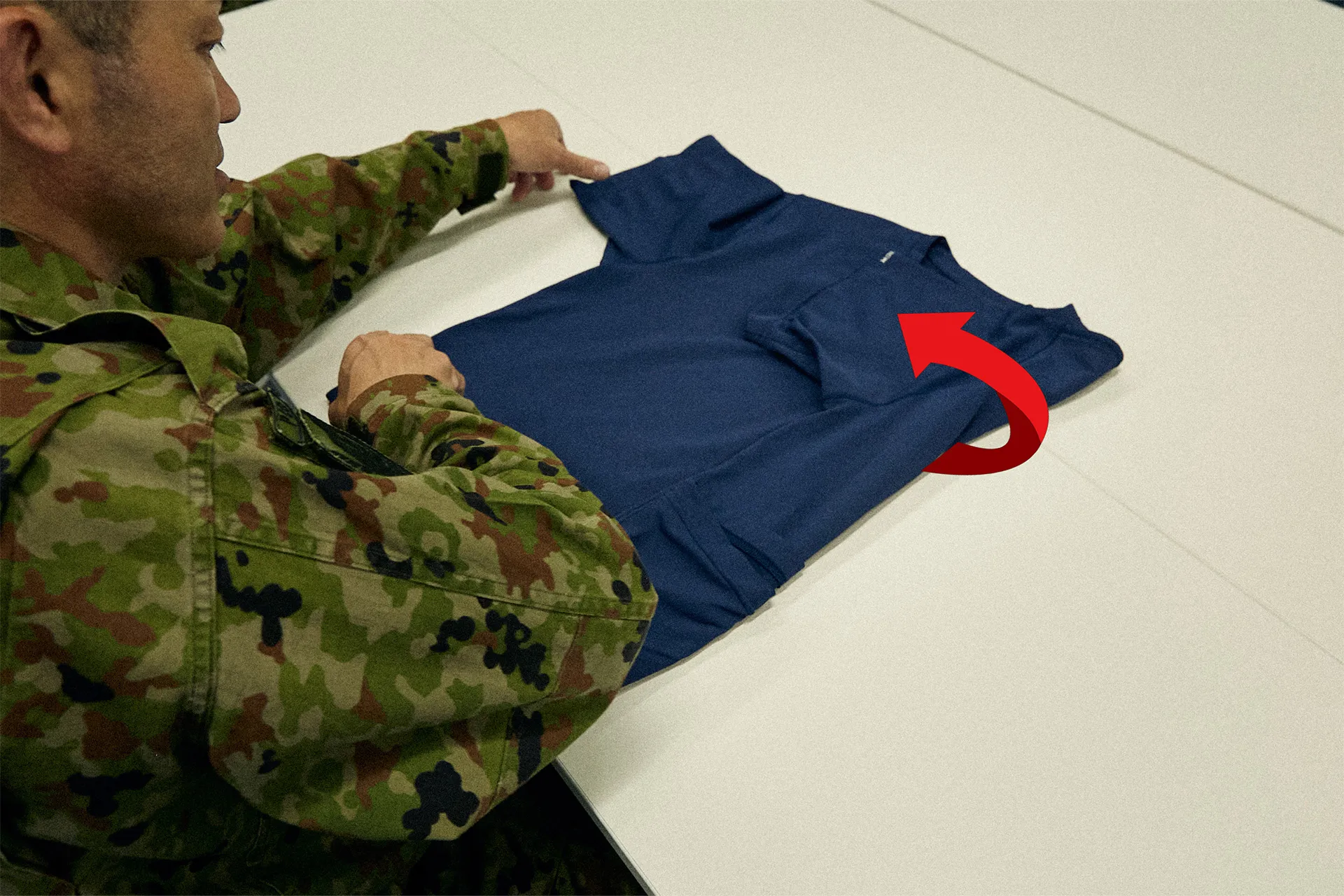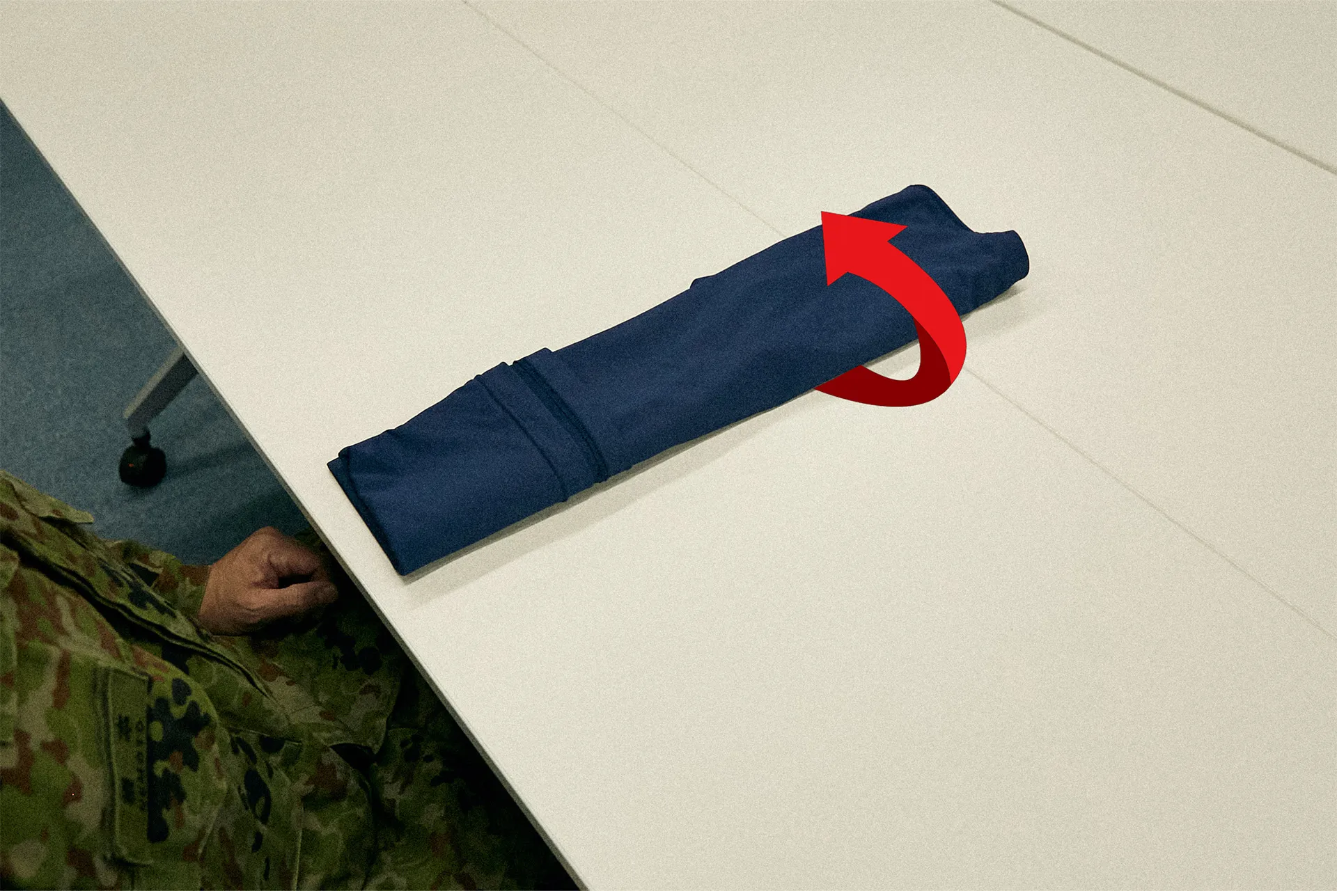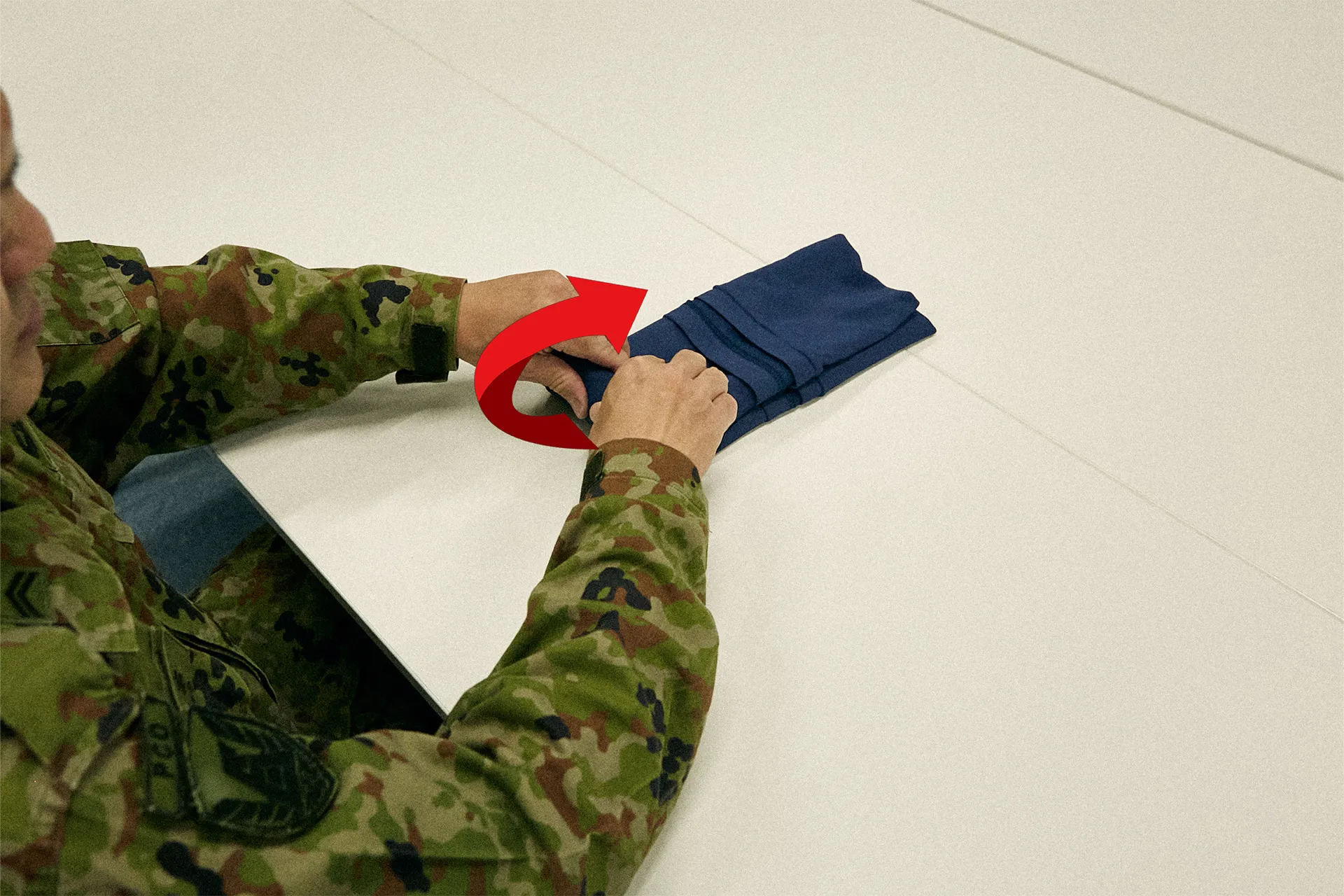 災害時に腕を骨折、捻挫、脱臼したとき、患部を固定するために三角巾などが必要になることがあります。これも自衛隊メソッドだと簡単につくることができるそう。