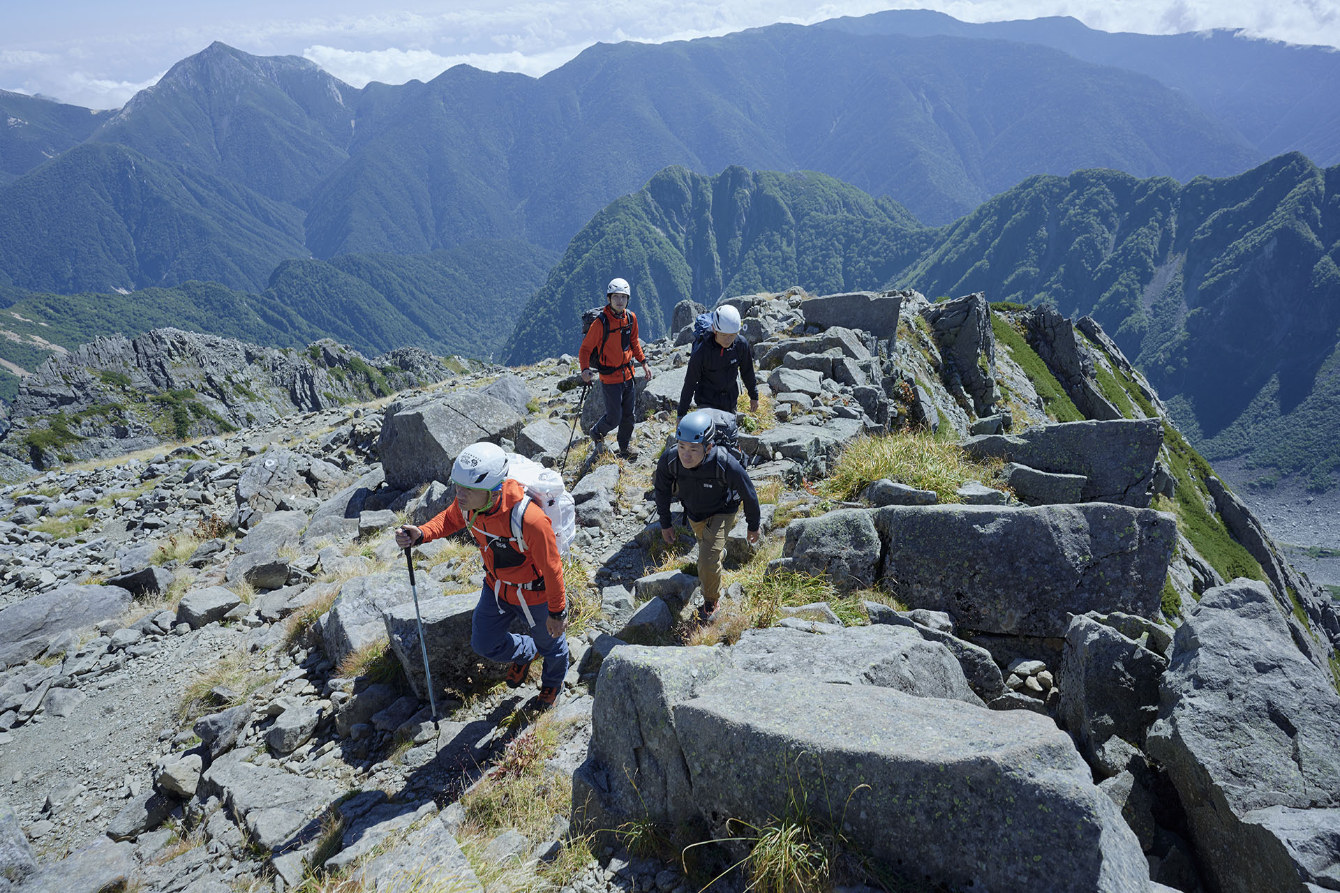 実績豊富な国際山岳ガイド、スノーボーダー、クライマー、そして、気鋭の若手登山ガイド。活躍するフィールドもバックボーンも違うマウンテンハードウェアアスリート4人がチームを組んで、北アルプス・北穂高岳へ。「頂を求める者」として刺激し合った2日間の山旅になった。