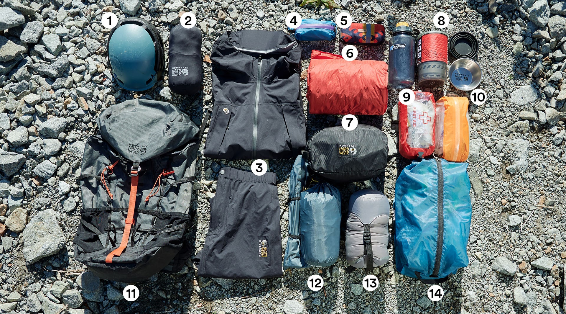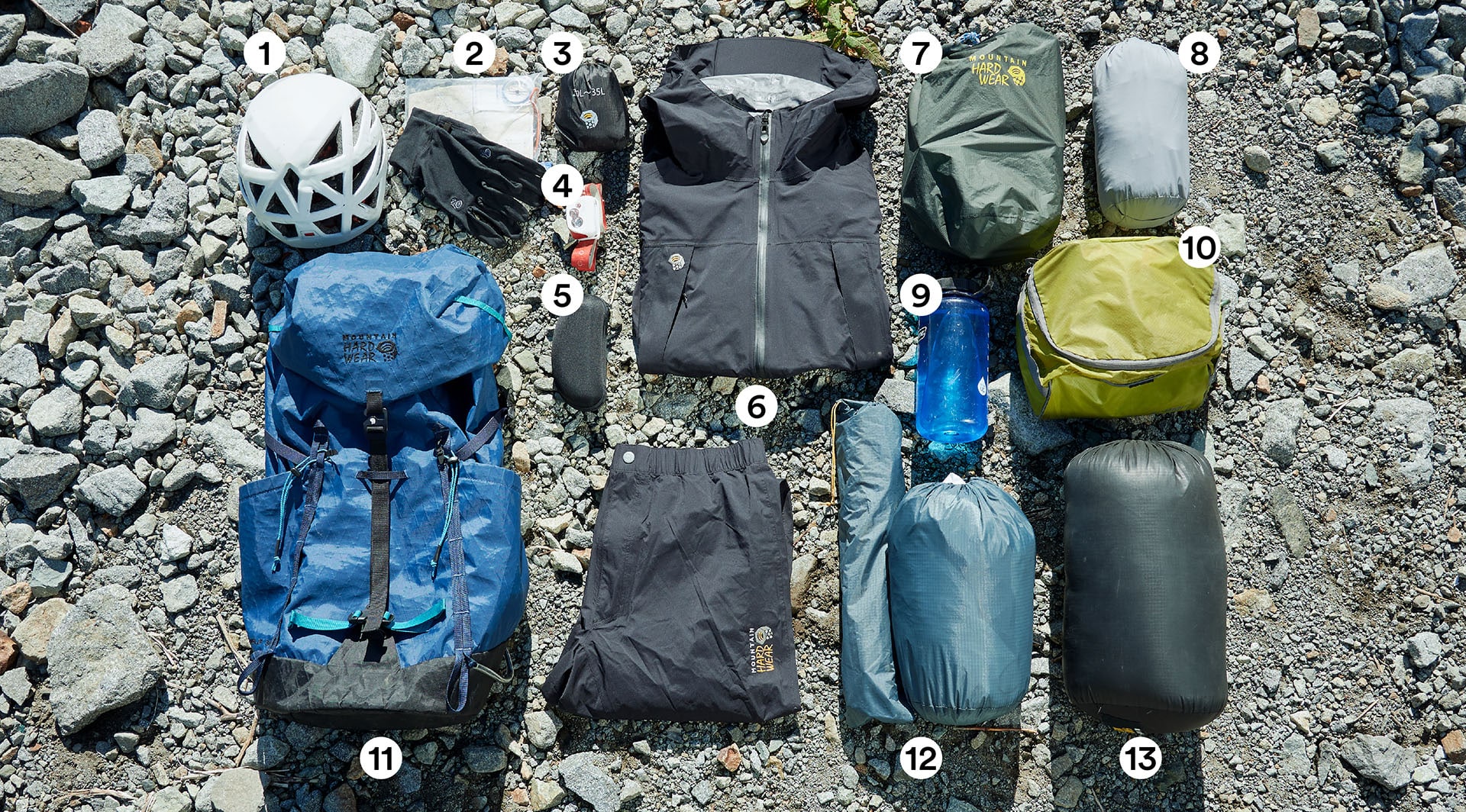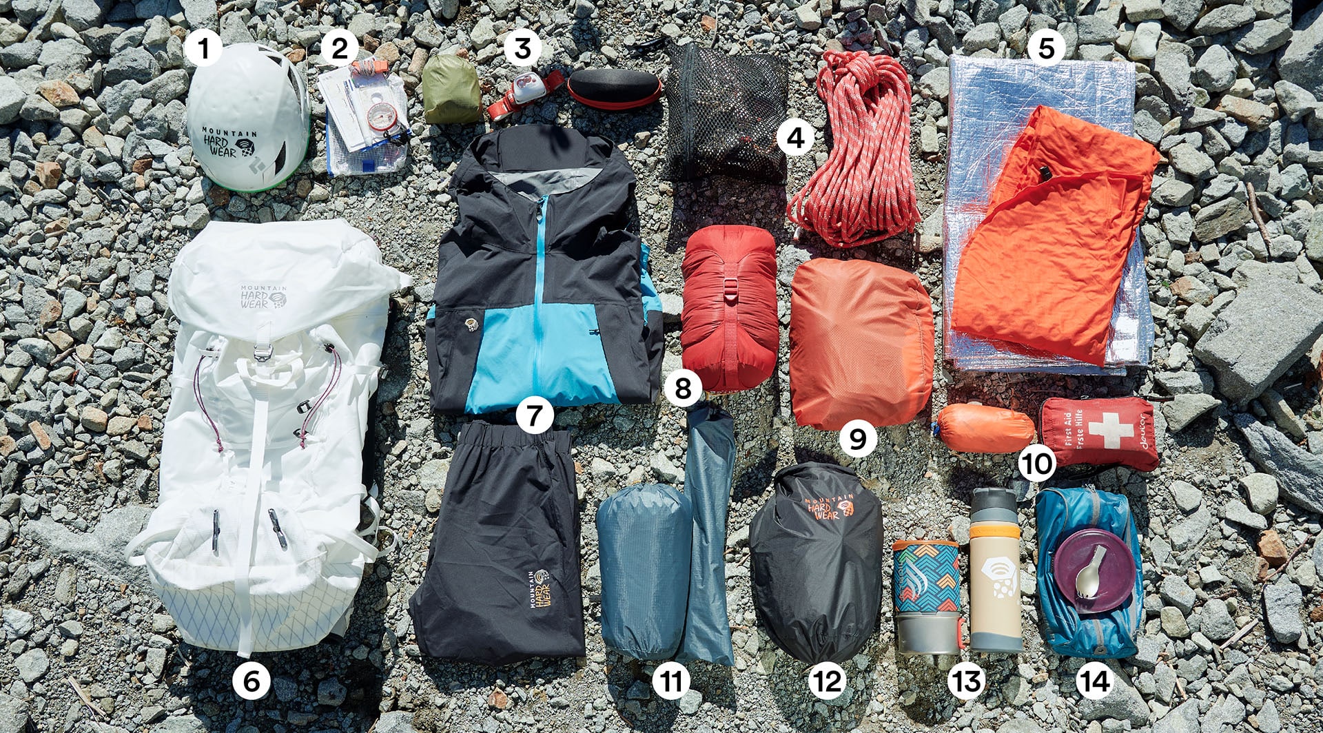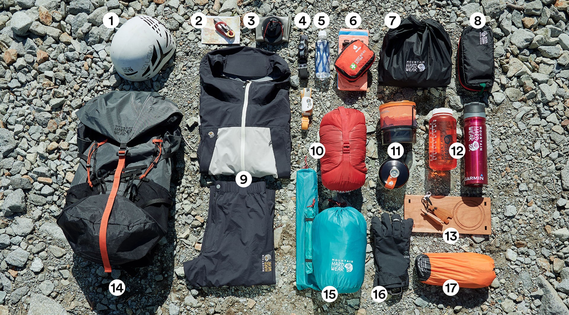 ①ヘルメット②地図、コンパス、ホイッスル・小物類:日焼け止めや予備のヘッドライト、ファーストエイド用の手袋などをまとめ、取り出しやすいように雨蓋に入れて携行