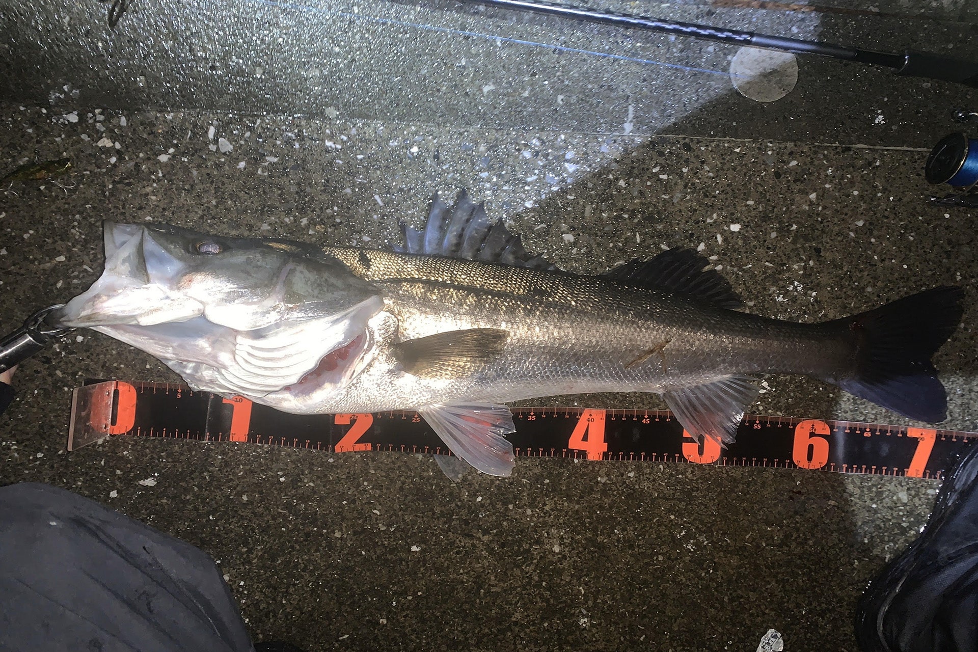 ▲粕谷さんが過去に釣り上げた最大サイズのマルスズキ(サイズ:73cm)。