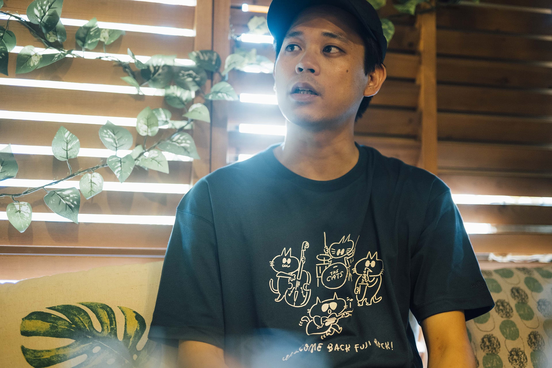 この日、粕谷さんが着ていたTシャツは、毎年恒例のフジロック×コロンビアのコラボアイテム。人気イラストレーターの長場雄さんが描くオリジナルの猫バンド“THE CATS”のイラストがPOPで、イラストとともに描かれたメッセージは「WELCOME BACK FUJI ROCK!」。キュートな見た目とは裏腹に、吸湿速乾機能の“オムニウィック”や紫外線カットの“オムニシェイド”など、フェス向きの機能を備えています。