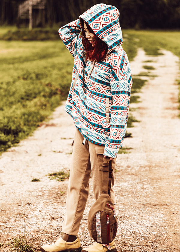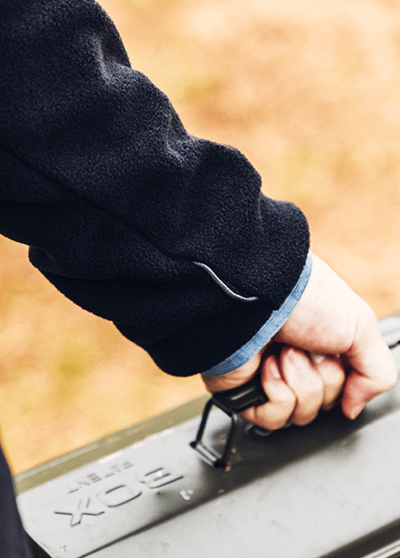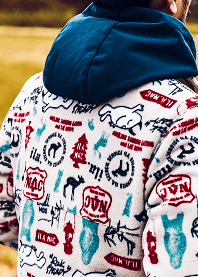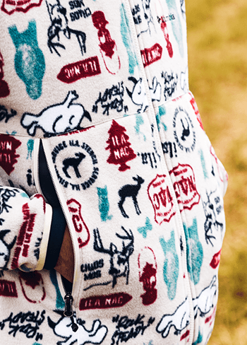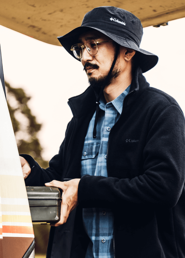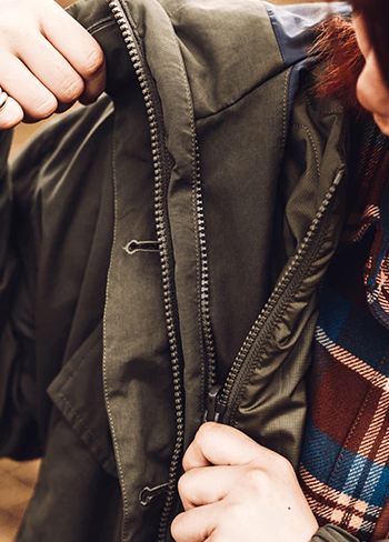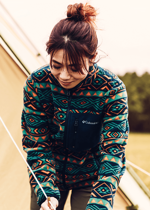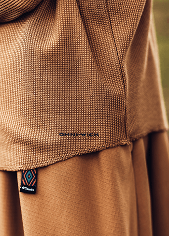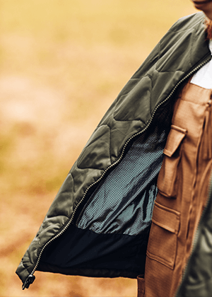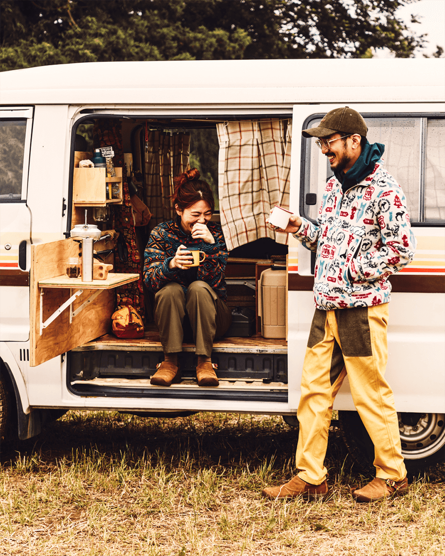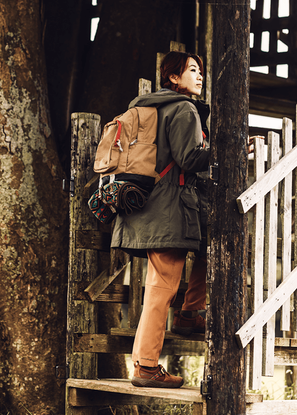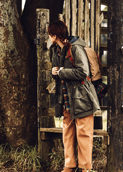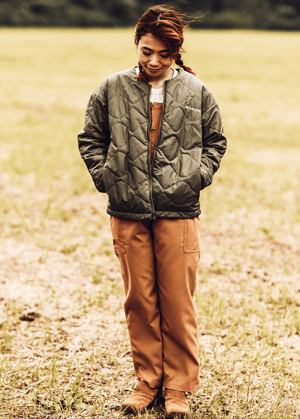 独自の保温機能オムニヒート搭載のMA-1が3in1システム「インターチェンジ」で仕込まれたマウンテンパーカージャケット。冬のキャンプではこれ1着で十分。日差しがあるときはMA-1、寒い夜は2着をくっつけて、小雨がふってきたら撥水加工が施されたマウンテンパーカーをシェルとして使える。メンズライクな着こなしから、腰回りで絞りをいれて女性らしいシルエットにも変えられるようスタイリングの幅をもたせたのは、いろいろなキャンプスタイルを経験しているYURIEさんならではのアイデア。