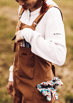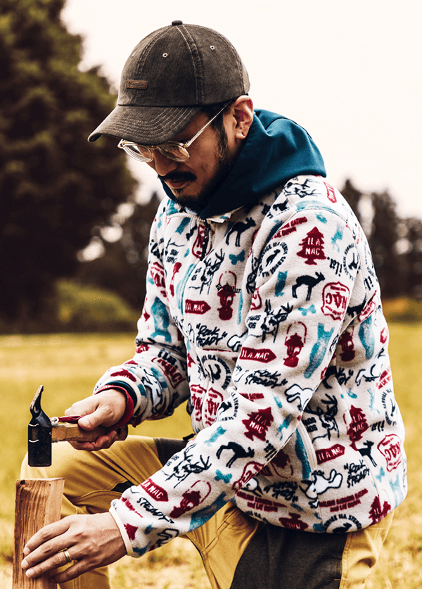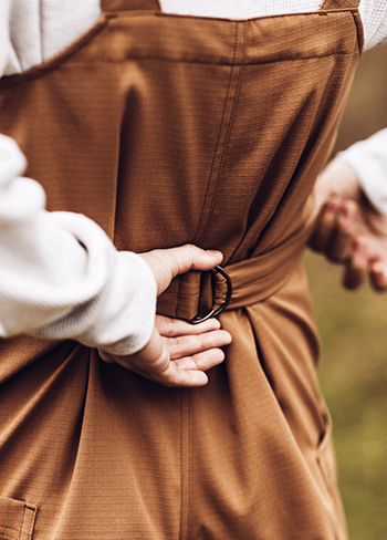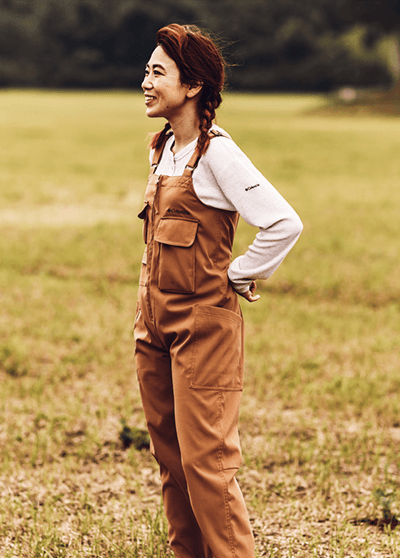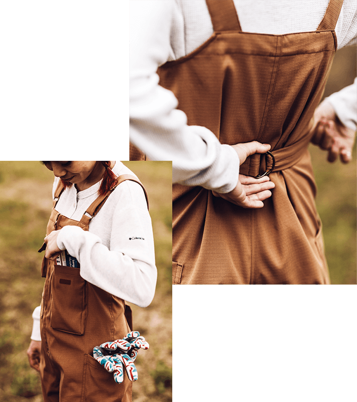 キャンプはペグやハンマー、ロープなど意外とこまごました道具が多い。スマートフォンもしまいやすい大型のポケットがたくさんついたオーバーオールはキャンプ場のお手洗いが使いやすいように前で深く開けられるファスナーで着脱しやすい工夫が。